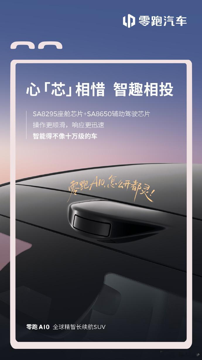 零跑A10内饰首秀,新车标配8.8英寸液晶仪表与14.6英寸2.5K中控大屏,视觉效果出色;搭载SA8295座舱芯片与SA8650辅助驾驶双芯片,响应流畅。AI“超级小零”接入通义千问大模型,语音交互自然灵活,带来有“活人感”的智能体验。汽场全开零跑a10零跑汽车