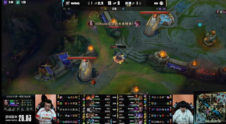 [17:03]Wei猴子野区转大配合队友再秒一次Elk库奇,下路中单solo,Xiaohu阿萝拉空大之后反向逃跑被Rookie乐芙兰追死,iG带着先锋还强拆掉了WBG中二塔!iG领先2K了!