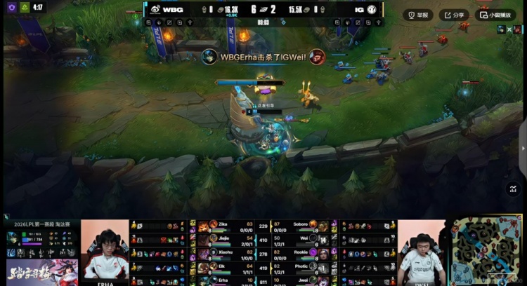 [8:22]iG拿下第一条小龙!但是随后下路越塔被Erha娜美水泡连续命中,直接被过热防御塔换掉俩人,Wei猴子交大和闪也没换掉Erha娜美,这波相当于WBG打出1换3!