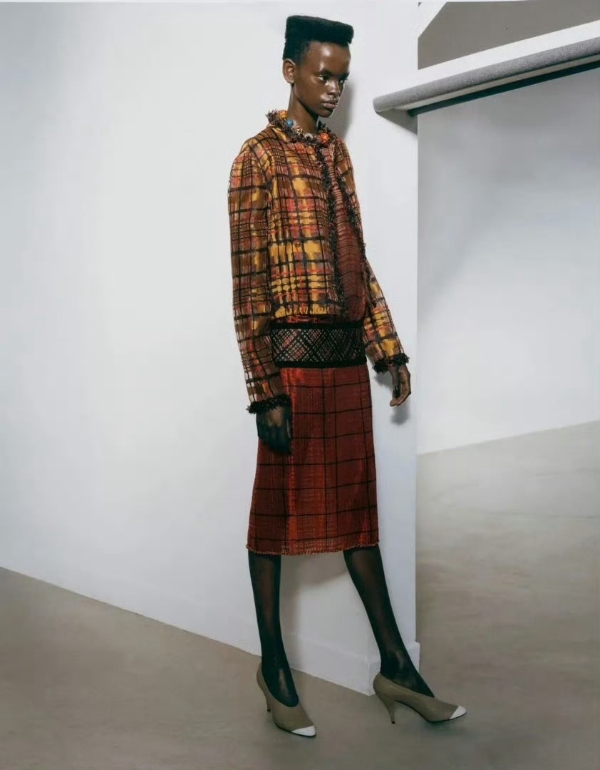 深灰高领是秋冬的底色棕色皮带勾勒出岁月的轮廓。展开的格纹披肩如同打开一本旧相