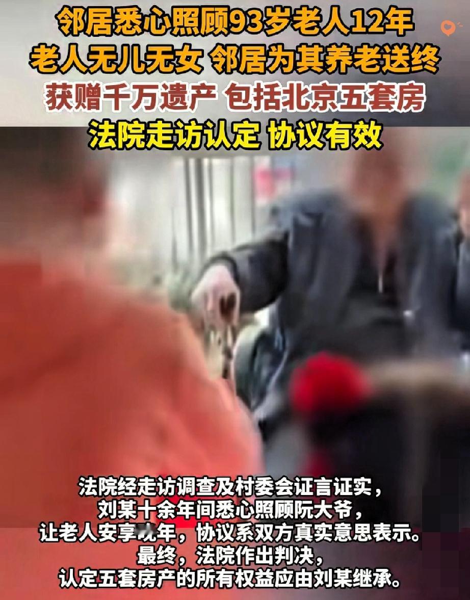 善有善报! 北京这起判决太解气,真心永远不会被辜负! 93岁阮大爷无儿无女,身边有4兄1妹却无人照料,邻居刘某于心不忍,一照顾就是12年。 两人在村里见证下签了遗赠扶养协议,老人后来拆迁获380多万补偿与5套房,又重新立协议明确财产全归刘某。 可老人一走,多年不闻不问的亲属突然跳出来争财产,实在让人心寒。 法院最终认定,协议真实有效,刘某尽到生养死葬义务,理应继承全部遗产,那些未尽责任的亲属无权干涉。 血缘不是白拿遗产的借口,真心付出才配得上回报。 法律守住了善良,也给了所有好心人最硬的底气。 你支持法院这个判决吗?