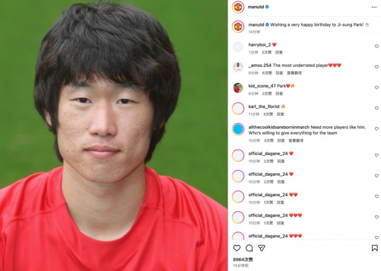 曼联社媒写道:祝朴智星生日快乐