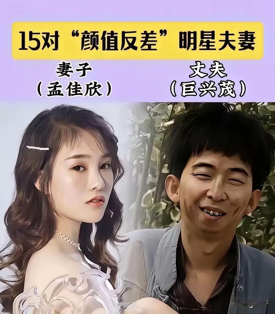 颜值反差的明星夫妻,老婆个个漂亮,老公长相普通但很有才 巨兴茂这个名字,大家可能不太熟,但看到他的脸就知道了。他是演员,也是导演。他长得确实不好看,个子也矮,但特别有才华。 巨兴茂是山西人,中央戏剧学院毕业。他演过《铁梨花》里的色子,《红娘子》里的舅姥爷,《勇敢的心》里的小六子。他长得丑,演的都是那种丑角,但演技特别好。后来他还当了导演,《灵魂摆渡》就是他拍的,口碑特别好。 巨兴茂的老婆孟佳欣,长得特别漂亮。她是圈外人,不是演员。俩人站在一起,反差特别大。但巨兴茂有才华,有钱,对老婆也好。孟佳欣嫁给他,肯定是因为他靠谱。 王祖蓝和李亚男这对,那可是娱乐圈的模范夫妻。王祖蓝是香港艺人,个子矮,长得一般。李亚男是华裔小姐冠军,个子高,长得漂亮。俩人站在一起,那叫一个最萌身高差。 王祖蓝是香港人,TVB出身。他是主持人,也是演员,还会唱歌。《百变大咖秀》里他模仿谁像谁,特别搞笑。他还演过《人间喜剧》里的司徒春运,《食为奴》里的高天宝。他是全能艺人,特别有才华。