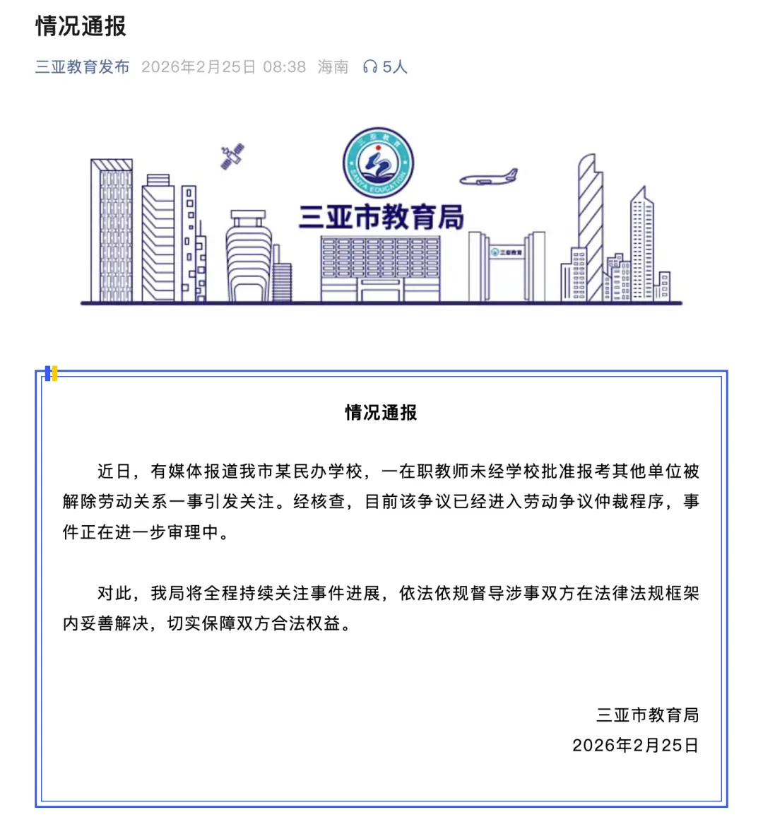 25日,三亚市教育局在情况通报中表示,将全程持续关注事件进展,依法依规督导涉事双方在法律法规框架内妥善解决,切实保障双方合法权益。