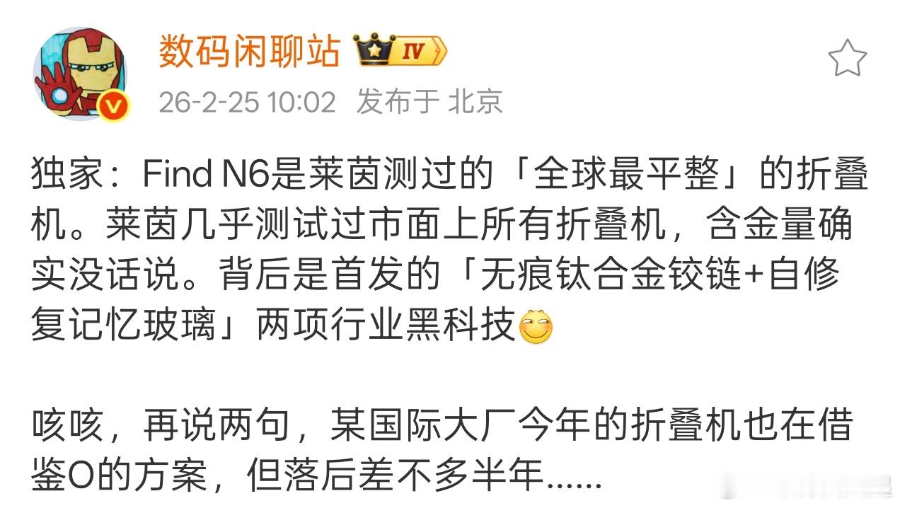 在「无痕钛合金铰链+自修复记忆玻璃」两项行业黑科技加持下,OPPO Find N6将成为全球最平整的折叠屏,有莱茵测试结果为证!更晚发布的苹果折叠屏在这块依然还会落后一代