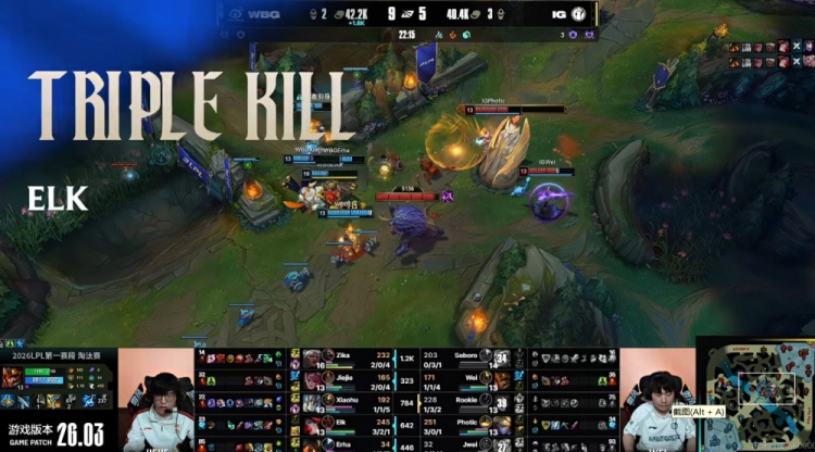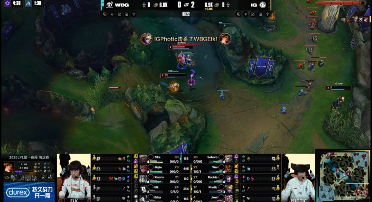 [25:19]下路iG想借助Rookie阿狸绕后TP动Elk女枪!但是Xiaohu加里奥直接大招落地保住队友,正面Erha泰坦出钩命中,Zika安蓓萨大招又一次命中了啊!Elk女枪扫大,击杀掉了复活起身的Soboro亚恒之后再拿三杀!又是WBG的1换3!经济差快6K了!
