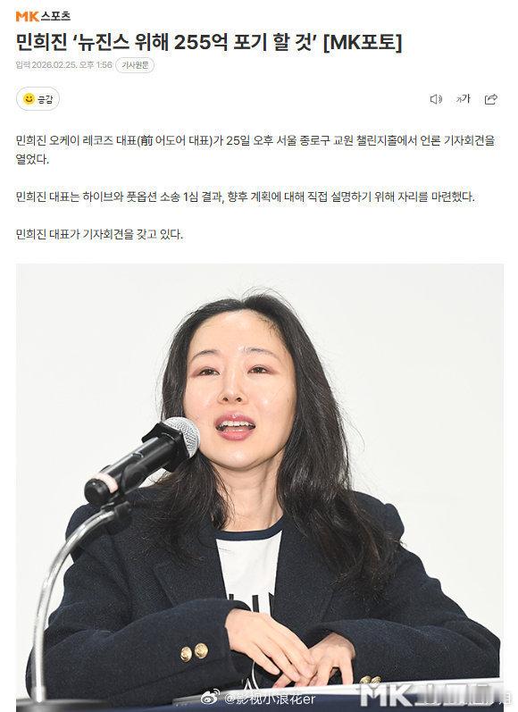 闵熙珍提出放弃255亿韩元赔偿闵熙珍愿为NewJeans放弃255亿韩元 闵熙珍毅然放弃255亿韩元的法院和解金,只为换取HYBE撤销所有相关诉讼,不让NewJeans成员及其他卷入此案的人再被纷争困扰,这份为了守护而做出的抉择,满是力量与诚意。