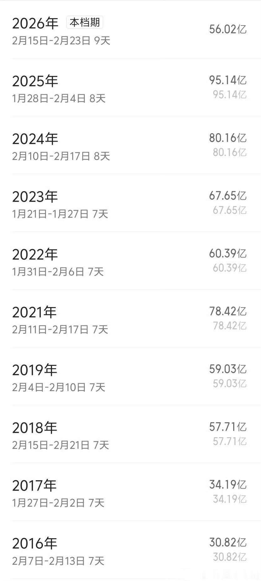 看了一下近几年的春节档票房对比,作为史上档期最长的春节档,却交出了最“冷清”的答