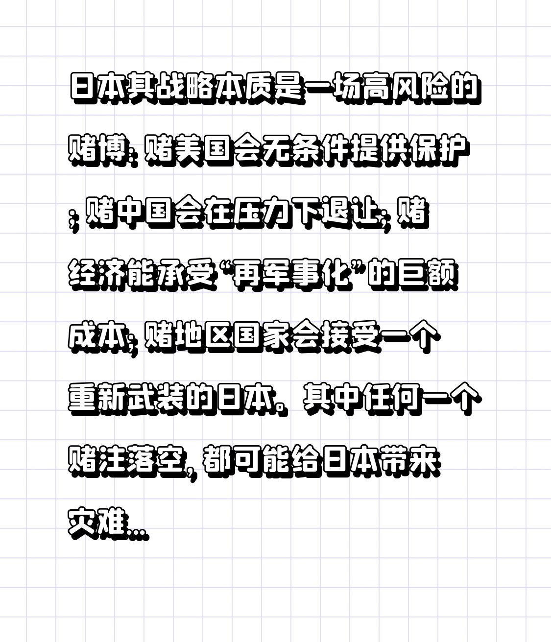 日本其战略本质是一场高风险的赌博:赌美国会无条件提供保护;赌中国会在压力下退让;赌经济能承受“再军事化”的巨额成本;赌地区国家会接受一个重新武装的日本。其中任何一个赌注落空,都可能给日本带来灾难性后果。