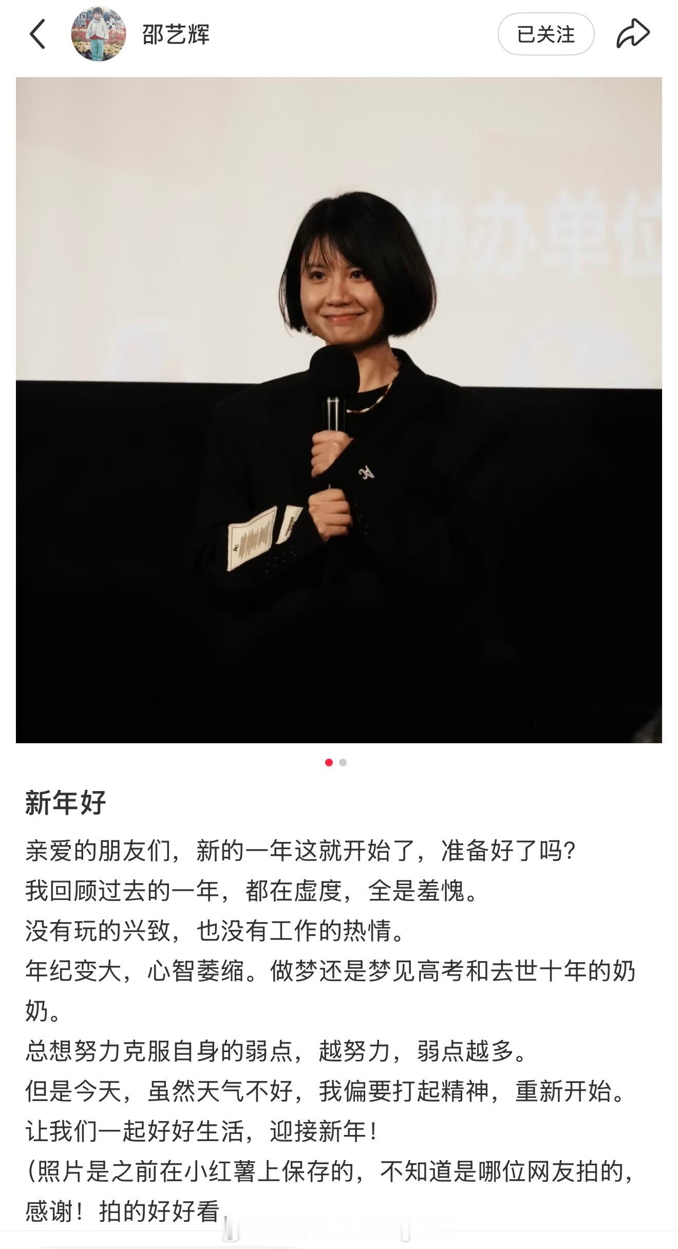 “亲爱的朋友们,新的一年这就开始了,准备好了吗?我回顾过去的一年,都在虚度,全是羞愧。没有玩的兴致,也没有工作的热情。年纪变大,心智萎缩。做梦还是梦见高考和去世十年的奶奶。总想努力克服自身的弱点,越努力,弱点越多。但是今天,虽然天气不好,我偏要打起精神,重新开始。让我们一起好好生活,迎接新年!(照片是之前在小红薯上保存的,不知道是哪位网友拍的,感谢!拍的好好看。”