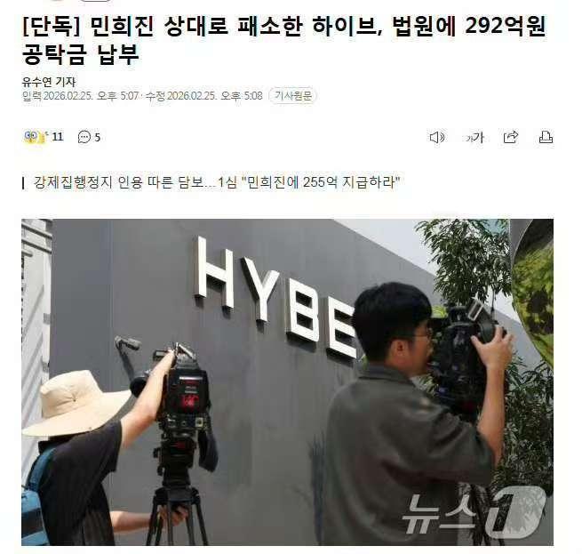 HYBE败诉需缴纳292亿保证金败诉给闵熙珍的HYBE,向韩法院缴纳了292亿韩元被判决支付闵熙珍前Ador代表255亿韩元的HYBE为了防止判决的临时执行,向法院支付了担保金。HYBE向法院缴纳292亿保证金