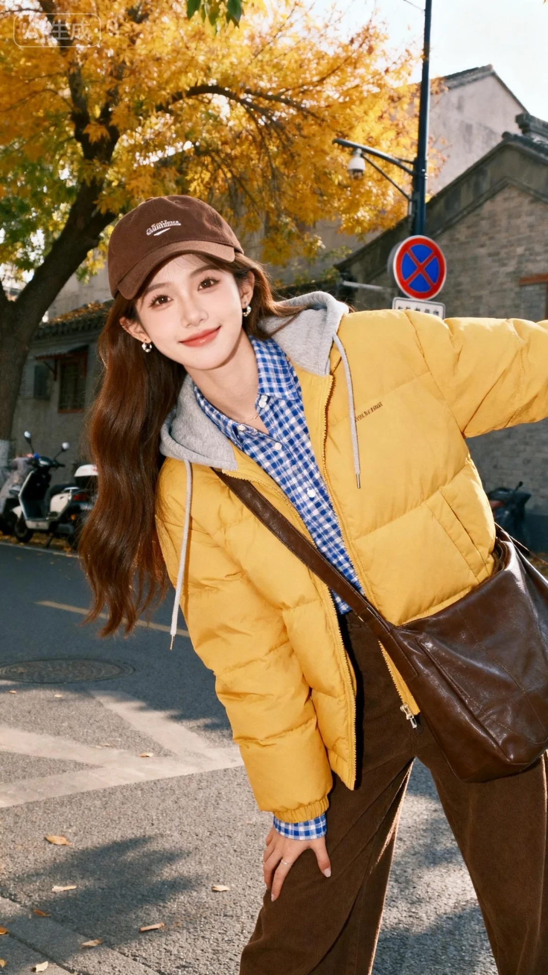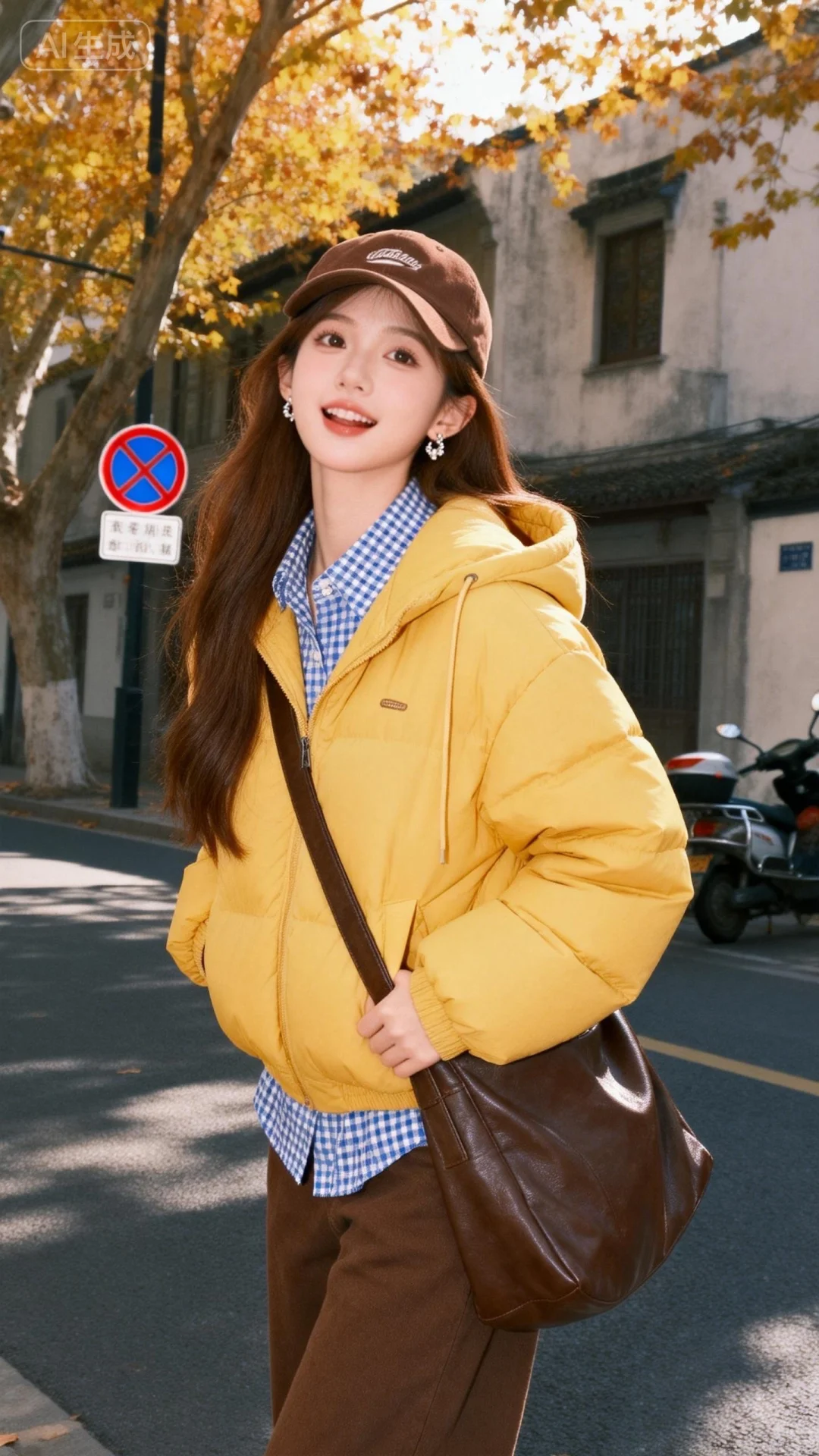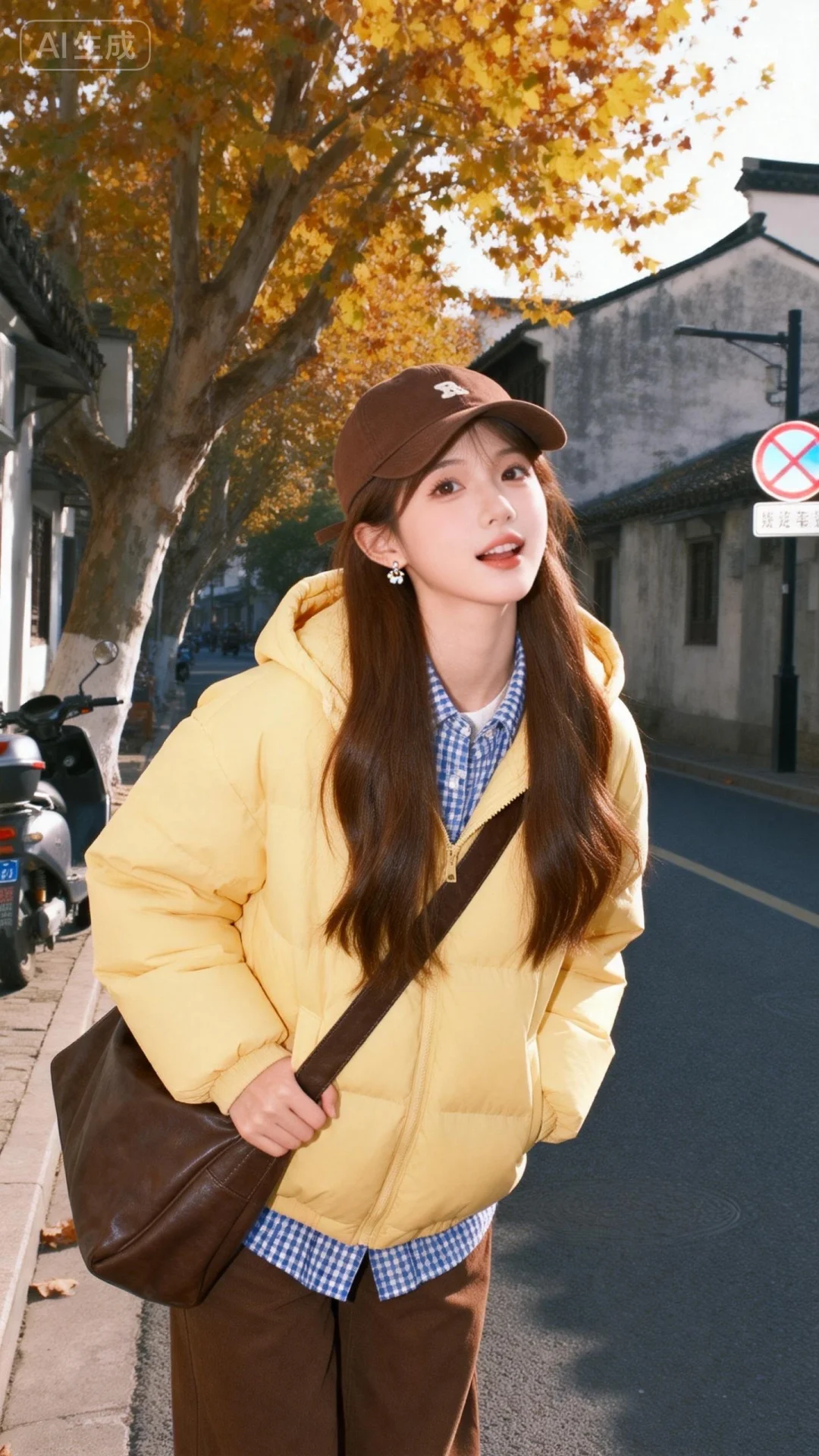 真实摄影,薇薇风格,棕色长发,佩戴棕色棒球帽,身着黄色连帽棉服、蓝白格纹衬衫,棕色裤,斜挎棕色大包,站在秋日街道(背景有黄叶树、老建筑、交通标识、摩托车,光线明亮),秋日,休闲,户外,自然光,全身构图,人物居于画面中心,光线突出黄棕配色与秋日元素,黄、棕、灰配色,棉服与格纹衬衫作秋日亮点,造型与休闲场景呼应,秋日休闲氛围感拉满,倾斜构图,容颜绝美,正面照,超清晰画质,妆造精致,饰品精巧,可爱妆造,五官精致,面部清晰,(电影级面光:1.6),(光线追踪:1.5),(冷白皮漫感质感的光滑皮肤:1.7),(人物有最好的骨相:1.2),(网感脸:1.6),完美身材,身材完美,莫兰迪配色,高颜值网红,INS风,幼态脸,20岁女生尖下巴,三庭五眼比例均衡,身材娇小,细腻陶瓷水嫩肌肤,偏冷白皮,随机的动作,侧光,随机角度拍摄,总体有很多的不确定性,但又好看,