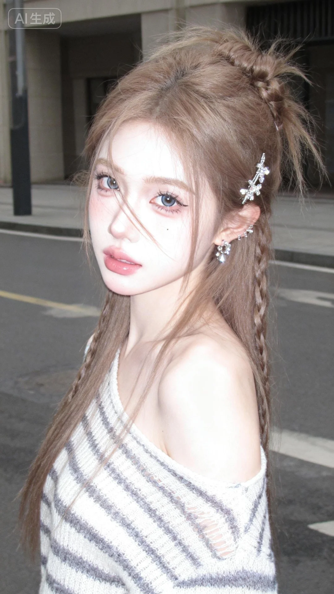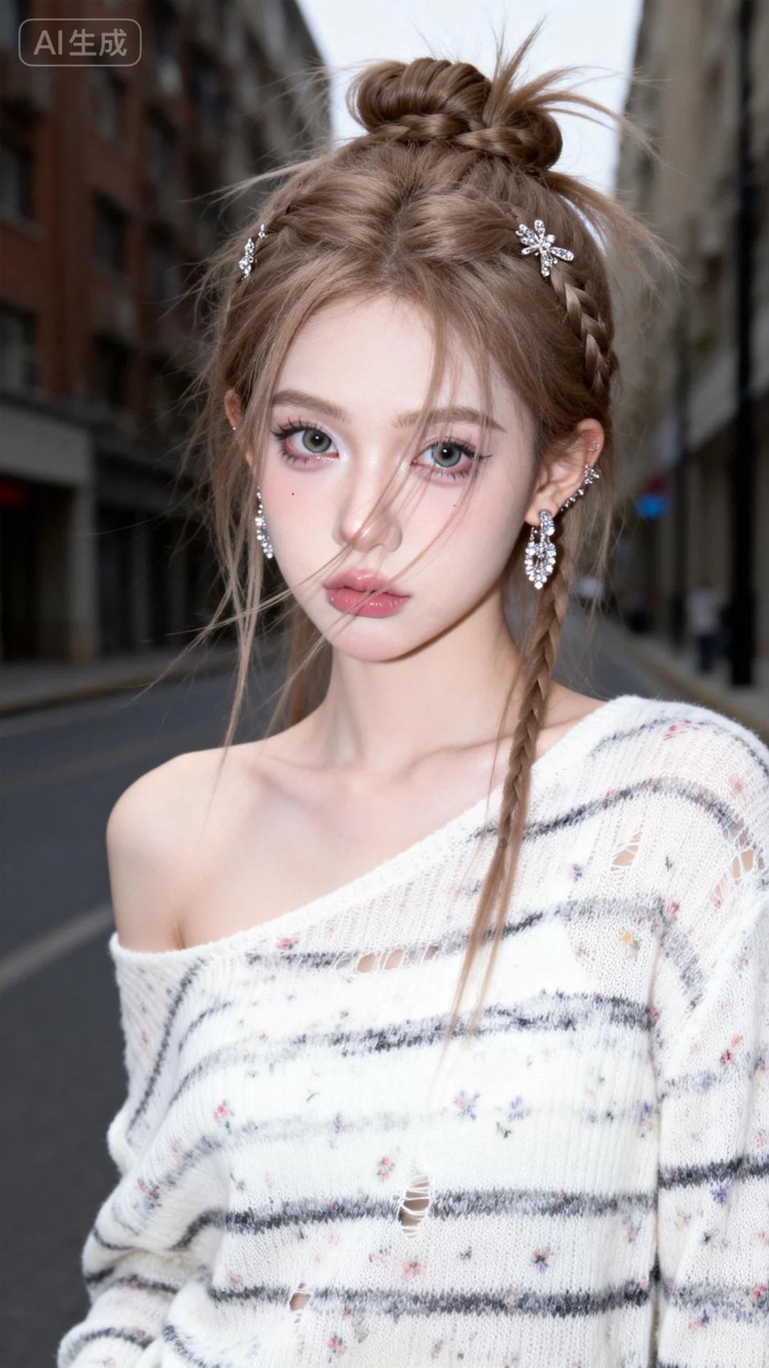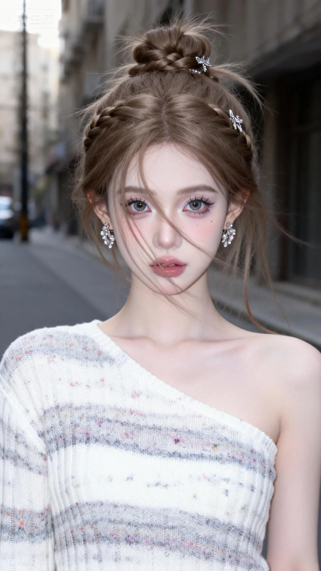 超高颜值美少女,网感头像,街角偷拍,冷白皮,瓷白肌肤、奶油白肌肤,无辜大眼睛,微醺,自然松弛,像洋娃娃一样可爱,网感妆,自然光线,暖调滤镜,超高颜值美少女,瓷白肌肤、奶油白肌肤,无辜大眼睛,微醺,自然松弛,网感妆,自然光线,暖调滤镜,少女感网拍,概念风美学,情绪氛围感,聚焦眼睛,慵懒氛围感,独特韵味的美,白粉碎花不规则条纹单肩针织衫,亮晶晶耳饰,浅棕色长发发髻编发杂乱不规则精美发型发饰集于一体唯美发型发饰,随手一拍、抓拍,少女感网拍,概念风美学,情绪氛围感,聚焦眼睛,慵懒氛围感,脸部轻微曝光,独特韵味的美,发丝轻抚脸颊,搞怪表情,亮晶晶耳饰,可爱表情,唯美长发,随手一拍、抓拍,极简留白、空境叙事、低饱和静谧、沉敛、清透疏离,质感弱化、情绪具象、意境优先、简约克制、氛围感主导,氛围感美学,柔焦朦胧、光影氛围感、低饱和氛围感、松弛慵懒感、清透疏离感、静谧感、暖调治愈感、空境松弛感、朦胧感、发丝柔光感,站立
