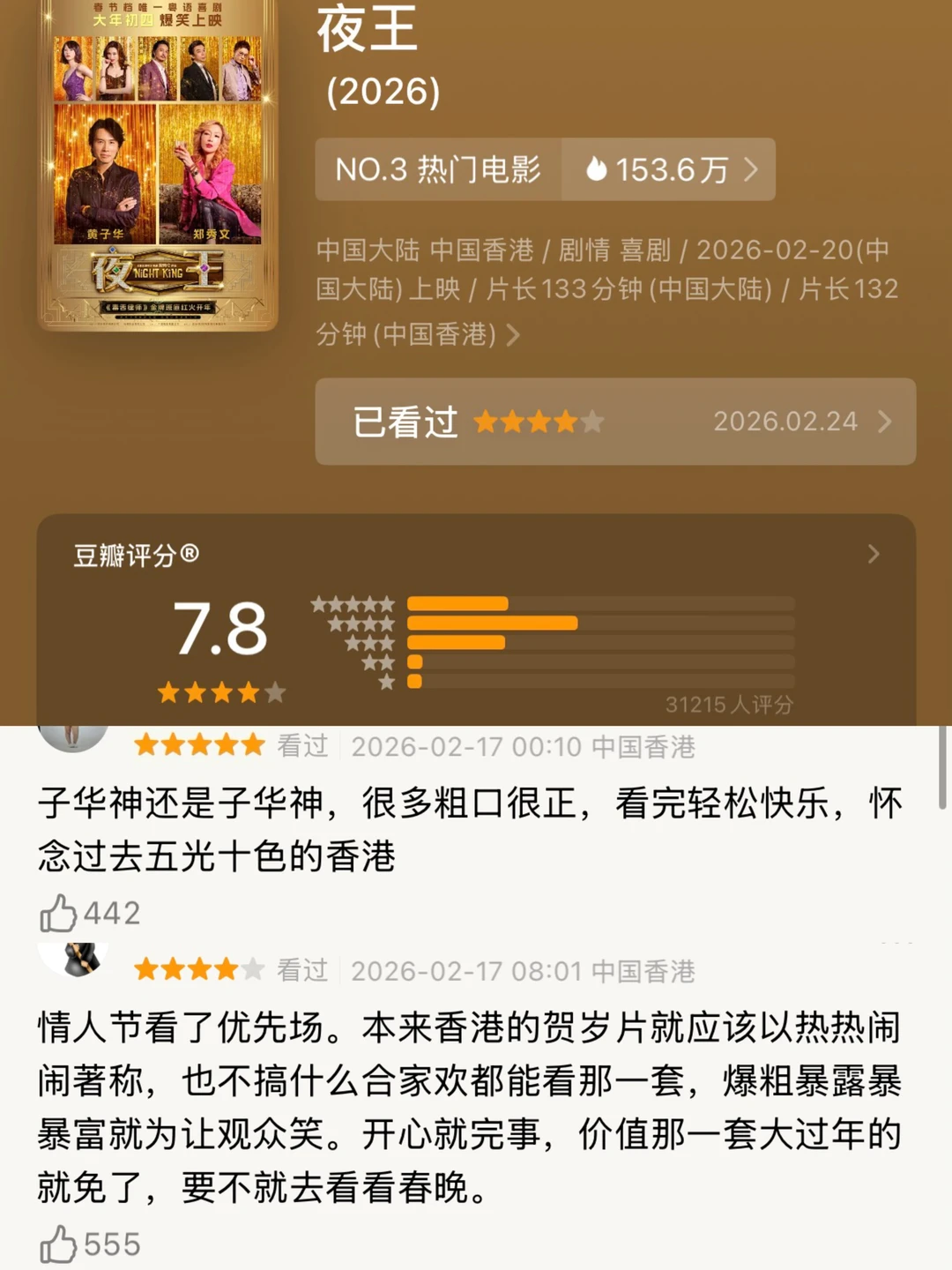 早在前些天就听广东的朋友说起《夜王》这部电影好看,听到昨天其他地区也开始上映的消息后马上就安排上了。先说结论:真的超出预期的惊喜,全程2个小时看的意犹未尽,属于是好笑又很解压的那种适合成年人看的爽片。看了下某瓣已开分7.8,妥妥的春节档黑马🔥 虽然有ye场背景,但这部影片真的不是那种低俗的“大尺度”,反而是用很荒诞、很搞笑的方式讲述了小人物在时代变迁下的挣扎和坚守,朋友间的两肋插刀,展现出了那种“世界艰难,我哋照行”的乐观。而且里面的女性角色更是各有各的带感之处💥 整部影片前半段的笑点真的过于密集,什么“学富五car”、“赴汤蹈fire”,各种粤语谐音梗和金句频出,笑到让人停不下来😂(鉴定完毕,听不懂粤语也一样能get到笑点)黄子华饰演的经理欢哥和土地那段如何更好的服务顾客的“嘟嘴卖萌”教学示范更是叫一个“绝”,全场都是“哈哈哈哈”的此起彼伏!还有欢哥为了保住饭碗,面对成为自己老板的前妻各种“求生欲”拉满的操作,这种欢喜冤家的设定我真的爱了! 但这部影片最绝的是它的反差感,能在你笑得最大声的时候,突然给你心里一击温柔的重拳。明明前一秒还在咧着嘴笑,后一秒就被他们面对资本收购时的绝地反击看红了眼眶。那些在ye场里互相扶持的底层小人物,那些“输也要输得漂亮”的倔强,真的太动人了😭而这种骨子里的“情义”,也是《夜王》最打动我的部分。 这种情义,是欢哥为了保住自己的饭碗自己一个人选择丢掉工作;是他在听到葵芳因为父亲生病住院不得不靠这份工作赚钱后对她的帮助;是v姐在被人坑后他选择抵押房产和她一起渡过难关;是ye场姐妹们为了保住饭碗的取暖;更是coco姐没有因为自己的利益而背弃大家的选择… 总之这部电影看完真的超级喜欢,如果你想看一部笑点密集、泪点自然、还能让你回味很久的电影,一定不要错过!于我而言,是今年春节档最值回票价的一部🎫