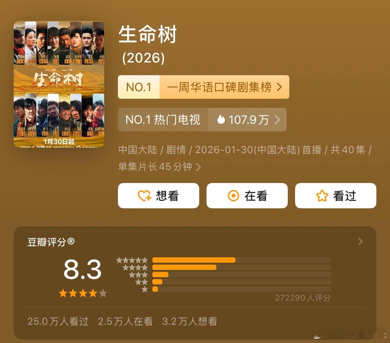 生命树豆瓣分数涨至8.3由杨紫、胡歌主演的电视剧《生命树》豆瓣评分持续上涨,开分8.1,已经涨到8.3!超27万人打分,好厉害!你们都看了吗?
