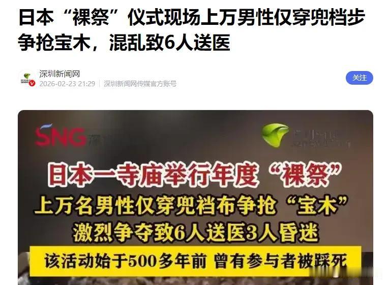 真是一个奇葩的民族!日本冈山裸祭闹上热搜,近万名男子仅着兜裆布在黑暗中疯抢木柱,半小时6人受伤3人昏迷,这般场面早已不是第一次上演。这项被日本定为非遗的习俗,打着祈福旗号,却屡屡酿成踩踏伤亡悲剧,2007年更是直接出过人命。传统值得守护,但以生命为代价的野蛮争抢,早已偏离文化本真。文明的核心是敬畏生命、坚守底线,而非固守陋习自我标榜,把野蛮包装成神圣,终究是对文明的曲解。 对此,你怎么看?日本艺术祭