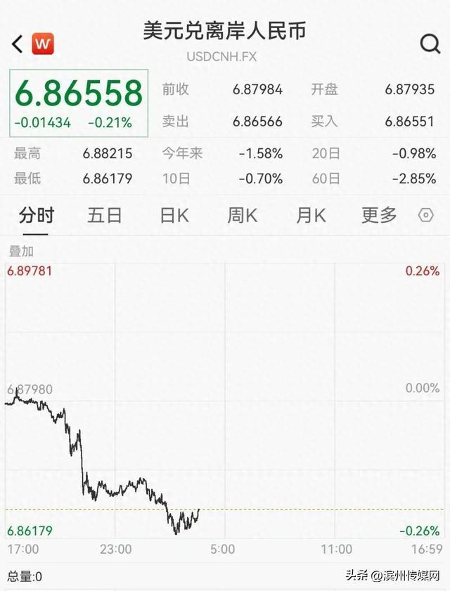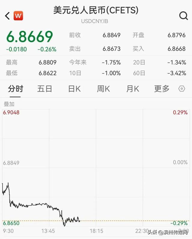 在岸人民币对美元汇率同样升破6.87关口,盘中最高升至6.8622,较前一交易日升值超200点。