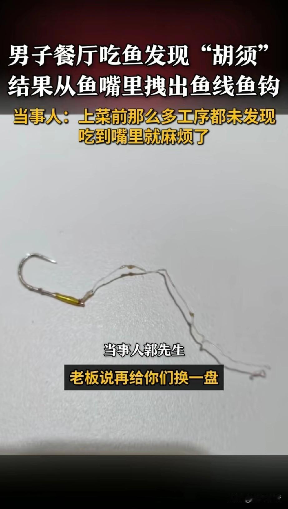男子和朋友在饭馆吃饭, 点了一条鱼, 鱼上来之后发现鱼有胡须, 手拽了一下,发现是鱼线, 随后用劲使劲拽出, 结果里面居然还有鱼钩, 这让他非常的生气, 送鱼的没有发现, 炸鱼的时候难道没发现?, 上盘的时候也没有发现吗? 这要是吃到嘴里面可就出问题了, 最后饭店赔了他们四瓶饮料, 还说他们下次来吃饭可以送俩菜, 这事就这么结了, 不过网友的评论就很有趣, 大家都说这是野生鱼, 还有人说这不是预制菜, 大家觉得这次吃饭体验有趣吗?