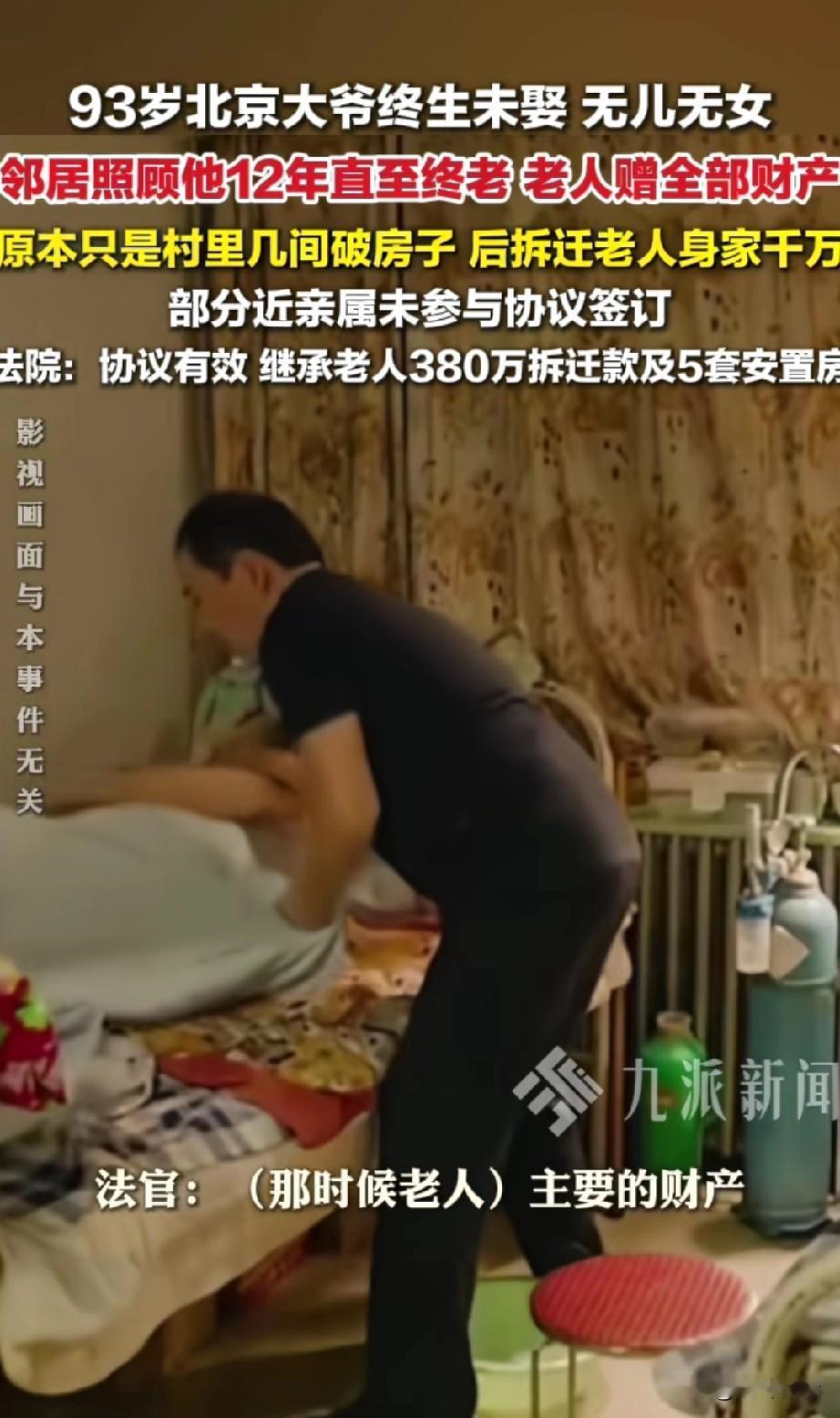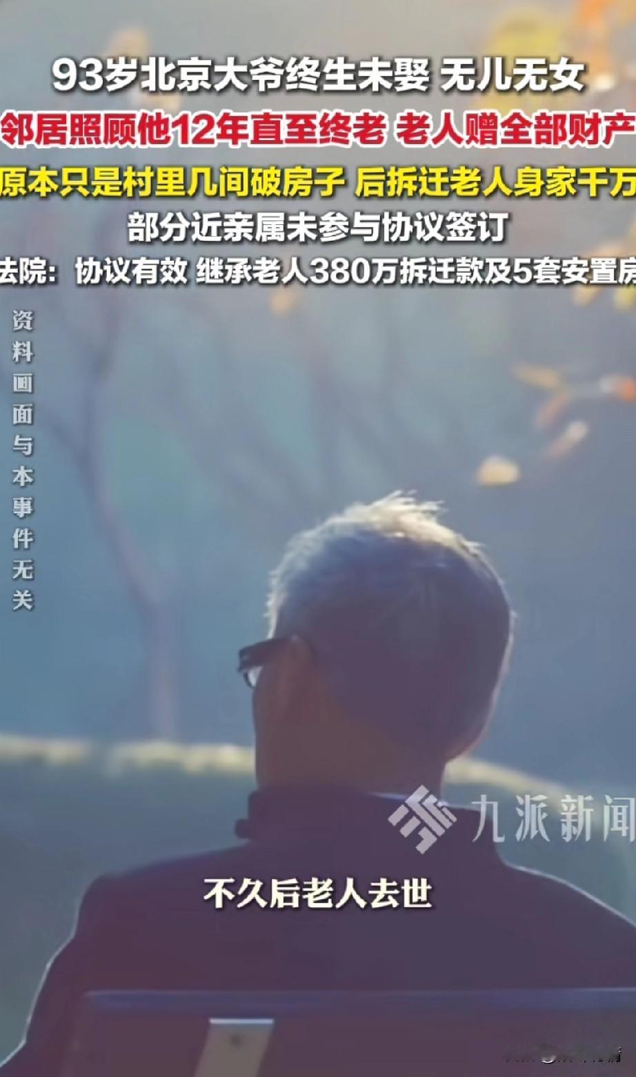 北京93岁老大爷, 一生终身未娶, 也没有自己的儿女, 年龄大了没有人照顾, 在村委会的见证下, 与邻居签署了赠养协议, 老人决定将自己的五间破瓦房赠送给邻居,邻居照顾了他12年, 在2023年时候要拆迁了, 法人要在公证处的见证下, 将数千万拆迁款都赠送给邻居, 他的部分近亲属没有参与签订协议, 知道这个决定后都非常的不满, 等到老人去世之后, 他们跳出来将老人的邻居告上了法庭, 想要瓜分老人的财产, 后来法院查明邻居确实尽到了赡养义务, 并且老人的资源协议有效, 支持数千万赔偿款归邻居所有, 这让老人的部分亲属傻眼了, 很多网友纷纷表示, 老人的邻居就应该得到这些钱, 毕竟只有他们照顾了老人12年, 还妥善的料理了老人的后事, 远亲不如近邻,这句话形象化了, 老人的亲属照顾老人的时候不出现, 等到要分老人的遗产的时候才跳出来, 这才是真正的人性, 幸亏老人签署有财产赠与协议, 要不然又便宜了这帮人!