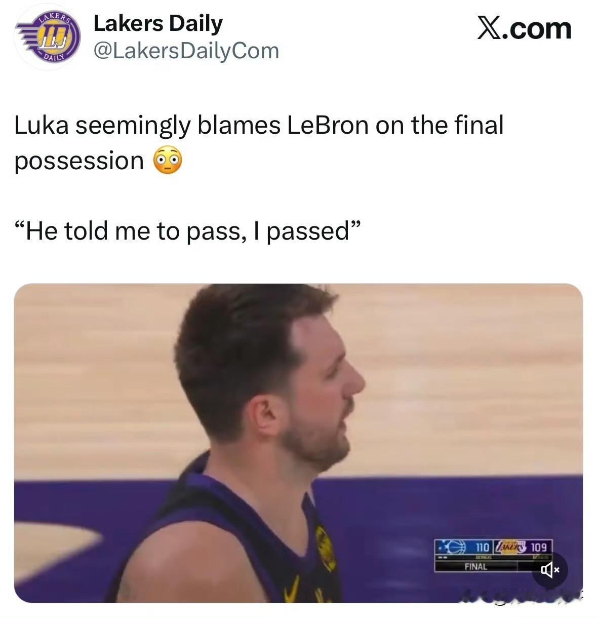 甩锅实锤?东契奇赛后回应“他让我传,我就传了”引热议! 今天湖人主场惜败魔术,输球不可怕,可怕的是当家球星扛不了责任,甚至引起球队内部矛盾,产生更多的更衣室问题,东契奇貌似就这样惹出事来了。 赛后,很多媒体都在围绕东契奇为什么不出手的问题在议论着,在那个位置,前面没有人,也是他经常投篮的距离,他竟然没投,选择运球前进一步后不知所措了。 国外有自媒体人表示东契奇赛后在场上说的是: "He told me to pass, I passed" (他让我传,我就传了)。如果真的是这样那岂不是妥妥的甩锅了。 这样湖人的更衣室很可能就会出现问题,而詹姆斯和东契奇的组合也会分崩离析,加剧了夏天分手的实锤。 其实这也不是东契奇第一次不敢出手了,想成为超级巨星就要有做杀手的能力,就要去勇敢投出那些英雄球,否则是没有资格成为一支球队的当家球星的,东契奇还需要继续努力了。年底的快乐是卡罗拉给的 东契奇 湖人