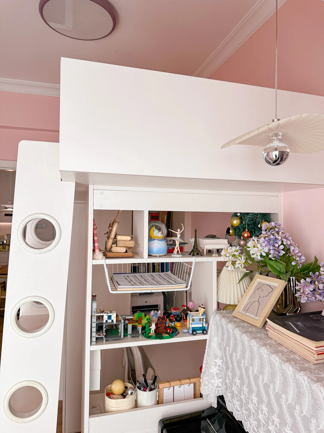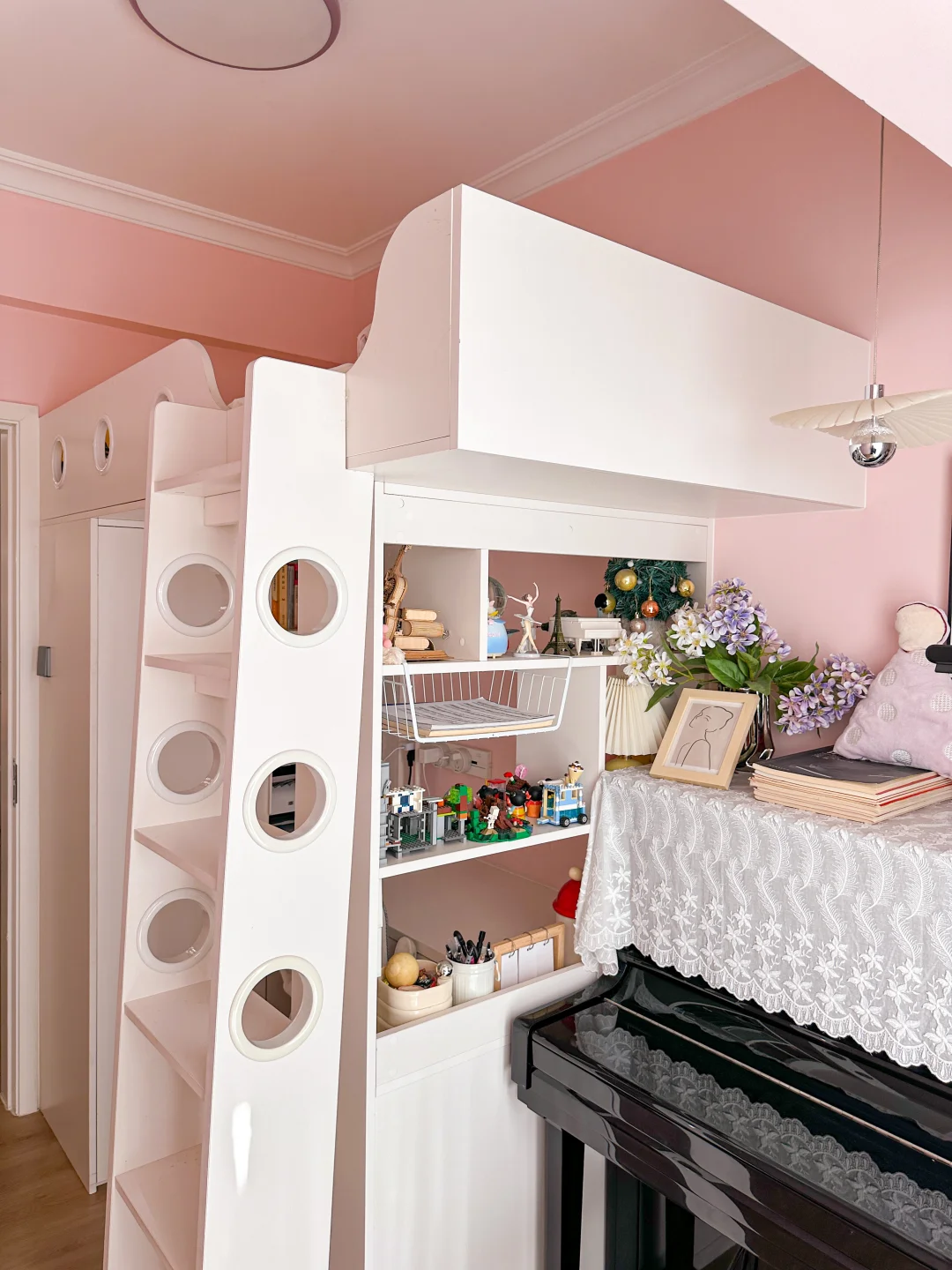 我家建筑面积60平米,套内42平米 2房1厅1卫 次卧只有6平米 我想实现床+书桌+衣柜+钢琴区的功能 绞尽脑汁想出来的方案 空间利用到了极致 层高:2.75米 床:1x2米 床底净空:1.75米 上部可以坐直,不能站起来 主要考虑底部空间使用频率高 不碰头 女儿说,她很喜欢,特别有安全感