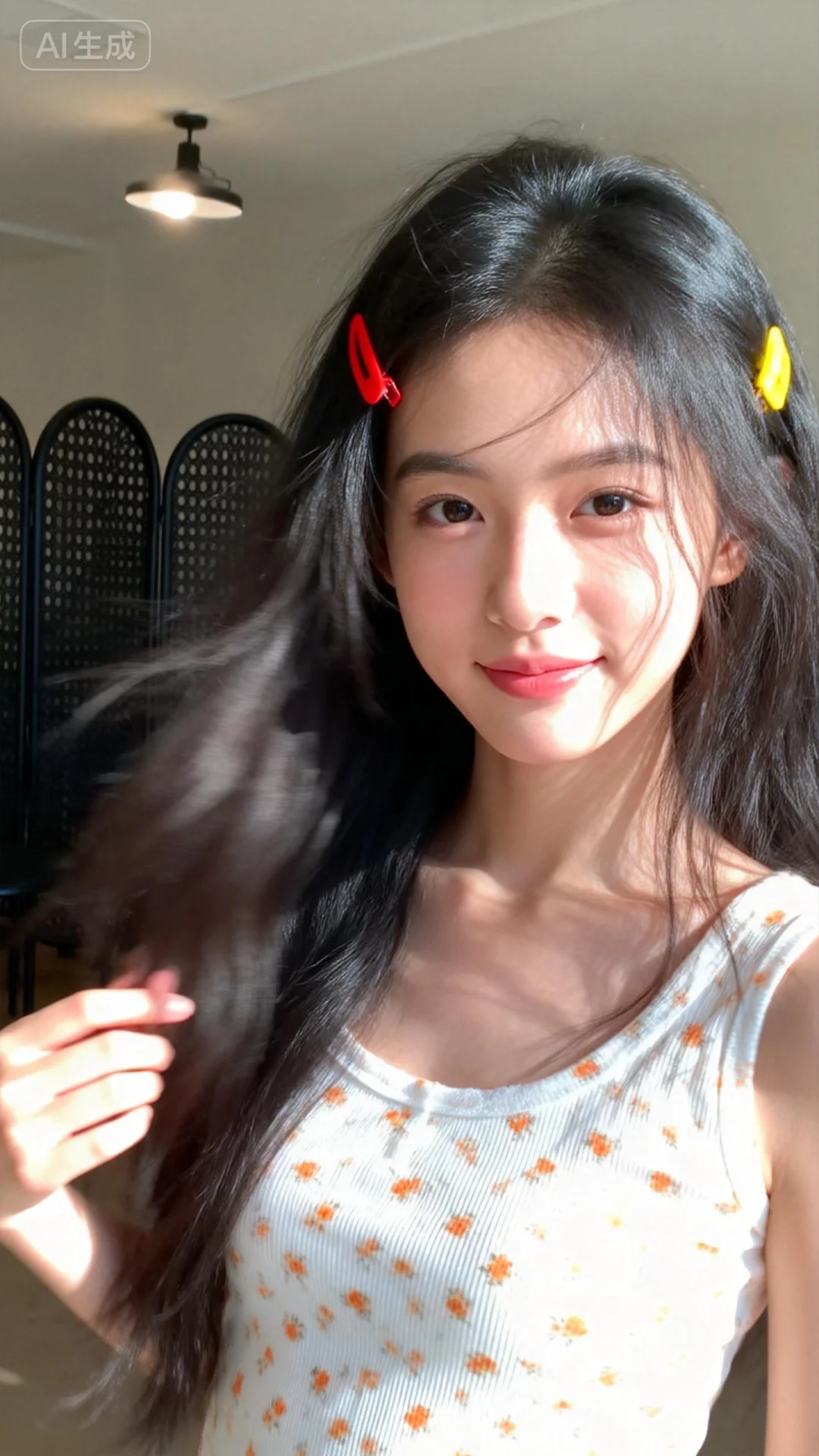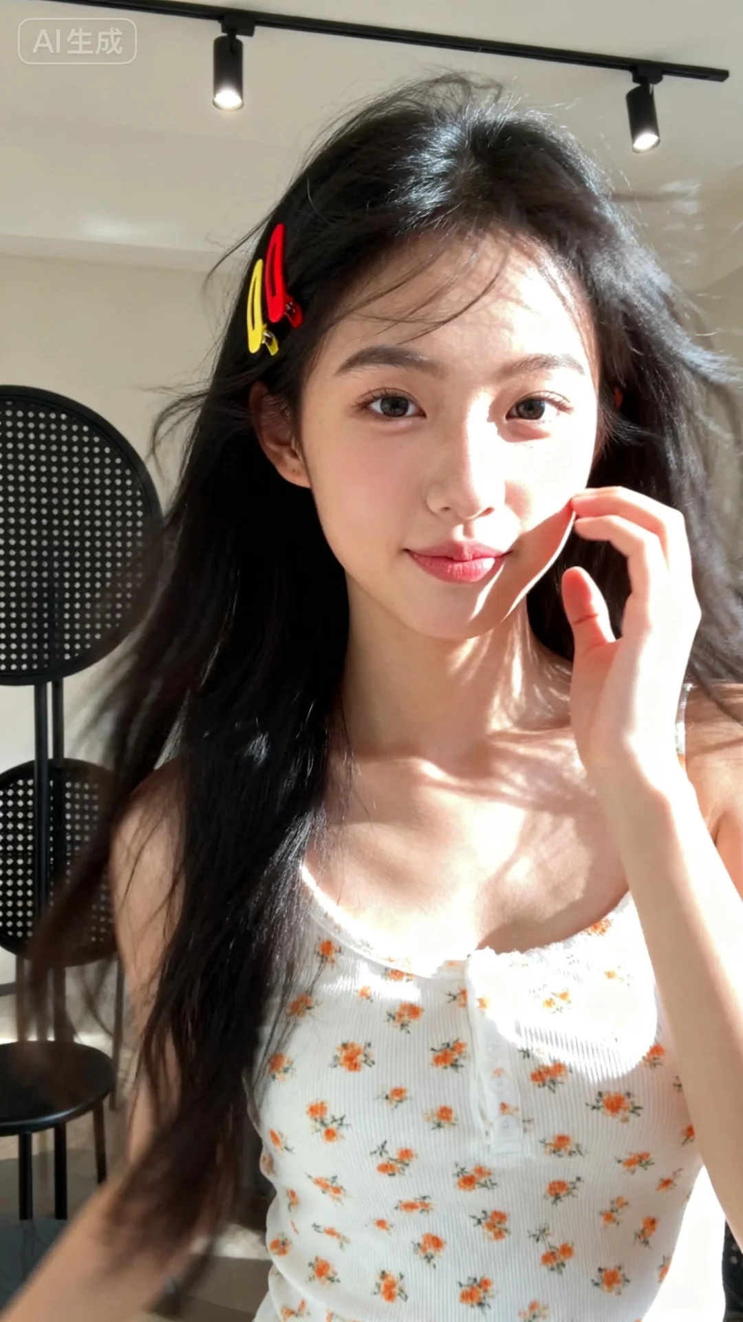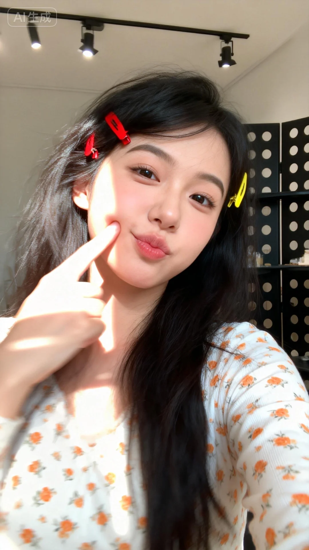 - 人物:长发女性,头发黑色,发丝随意自然,发间别着红色和黄色的发卡;脸部神态活泼俏皮,嘴唇微抿,手指轻触脸颊附近;肢体动作自然,姿态充满活力与可爱感。