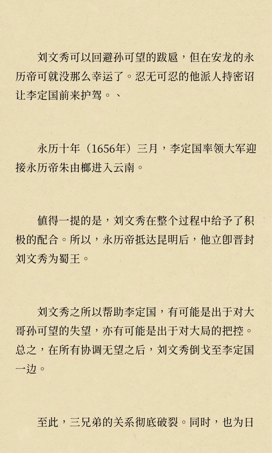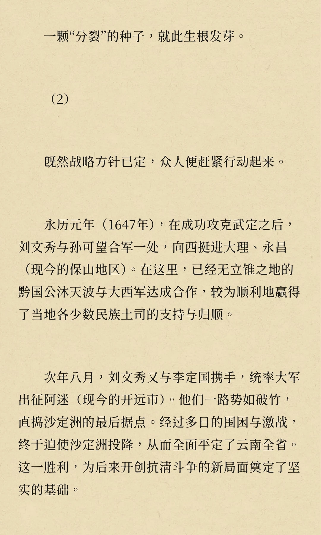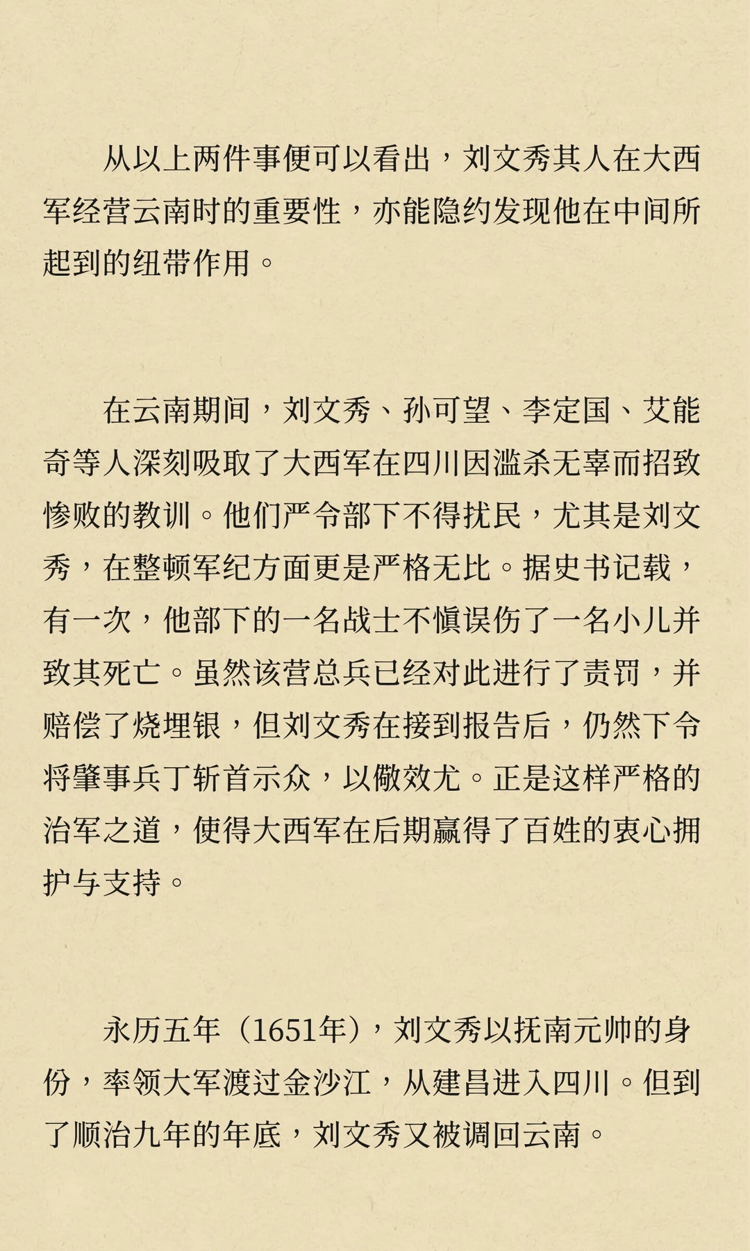 刘文秀作为大西军将领,曾与孙可望、李定国并肩作战,后因兄弟阋墙陷入内斗。他试图调和矛盾,但最终未能扭转局势。刘文秀在云南平定叛乱后,被调回四川,最终因病去世,南明永历朝廷不久后随之灭亡。