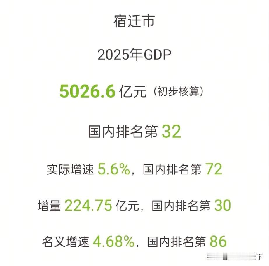 江苏省宿迁市人均GDP首超10万大关,34年前凑500块钱给刘强东上大学 在中国国内,有两个省曾经同为一家,后期分家后,各自走上不同的发展道路,那就是脱胎于南直隶和江南省的江苏和安徽两省。 这两个省有个共同点,一马平川的北部地区,反而是各自省内经济最差的地方,江苏的苏南比苏北富裕,安徽的皖南也比皖北经济条件好。 两省省内南北差异巨大,经济差异更是巨大,在国内都比较少见。 1992年,京东创始人,宿迁人刘强东考上中国人民大学,因为家穷,全村人5分,一毛,5毛,一块钱,凑了500块钱,还有76个鸡蛋,把他们口中的“大强子”送到了首都北京的高等学府深造。 30多年后,中国一线网购平台,京东的老板刘强东,回报家乡,年年给家乡的村里人发过年红包和各种各样的礼物。 从1992年到2026年,时间走过了34年,2025年宿迁gdp总量是5026.6亿元,宿迁常住人口约498万人,人均GDP也首次超越10万大关。 34年,在历史长河中只是弹指一挥间,但是对于宿迁这个苏北城市来说,却有着翻天覆地的巨大变化。 凑500块钱给村里孩子上大学,到全市人均GDP超10万元,可以看到宿迁这30多年的发展,可以说是突飞猛进,有着巨大进步。江苏城市gdp 宿迁 江苏gdp排名 江苏大gdp 宿迁城市排名 宿迁经济腾飞 宿迁行政区划 宿迁人均GDP 宿迁人口