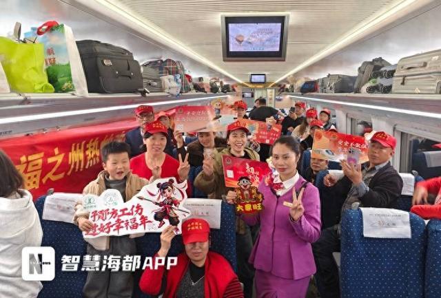 此次专列是福州市2026年“春风行动·就业援助季”重点举措之一。来自贵州黔西市的何艳今年45岁,这是她第一次乘坐高铁专列到福州务工。“我要去福州长帆机械有限公司打工,我丈夫在福州工作20年了。坐高铁又快又舒服,你们的服务又好,我真的很开心。”一旁的廖洪林自豪地说:“我在合瑞纸箱厂烧锅炉,工资还不错,这次一家人都来福州,工作更有干劲、更有归属感。”