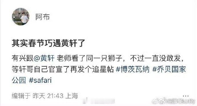偶遇黄轩与女友在南非旅游 黄轩携女友南非过年被偶遇,没有高调秀恩爱,乔贝公园同看狮子就很戳人。