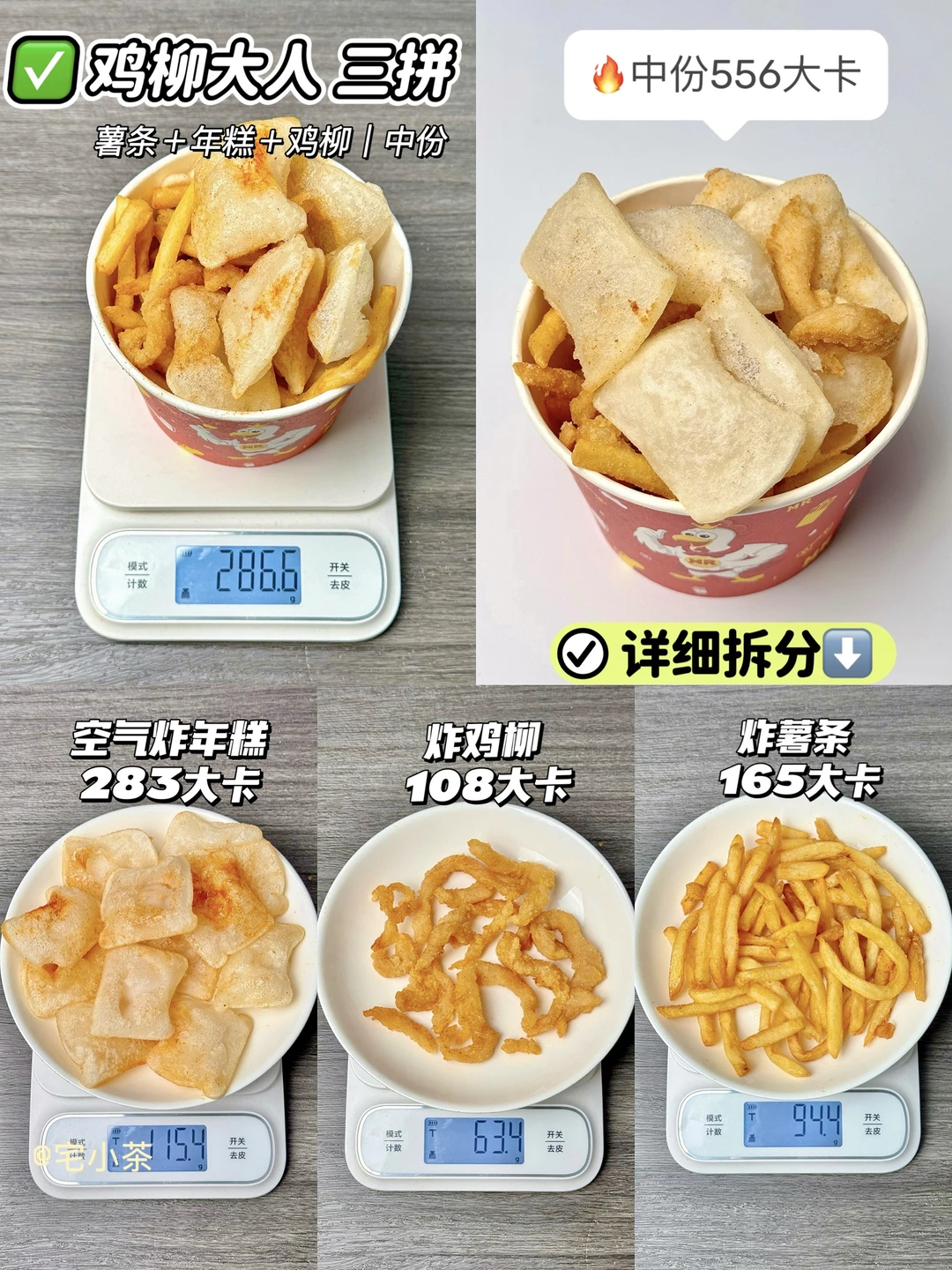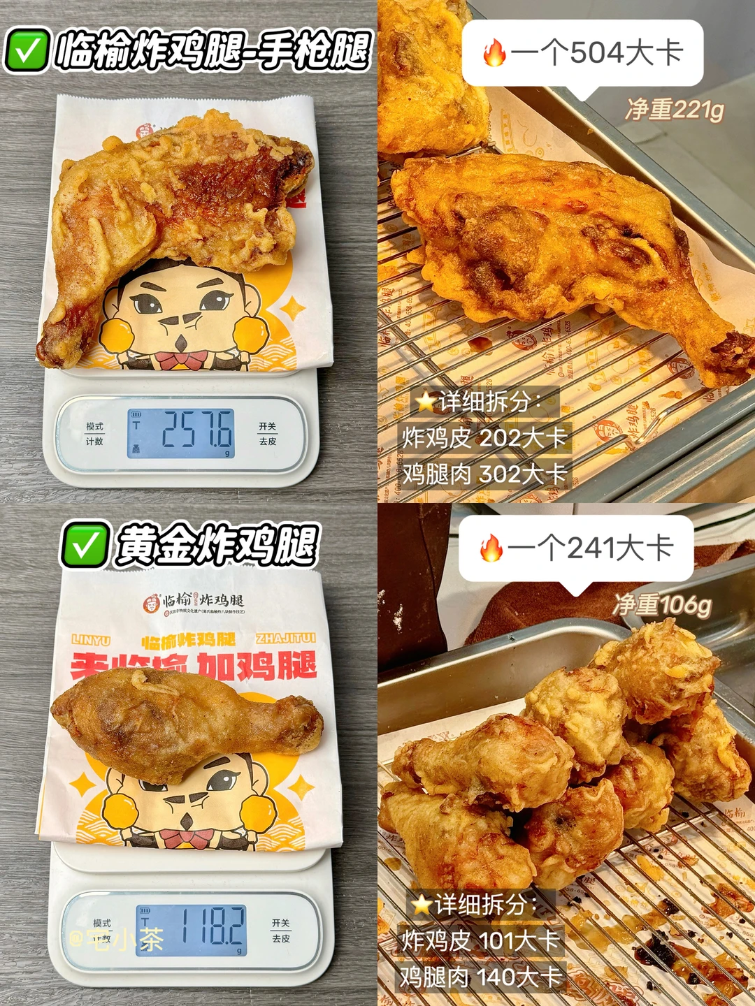 哈喽大家好呀,本期是各种油炸小吃热量实测~临榆炸鸡腿、鸡柳大人也都安排上啦! · ✅本期小吃包括: *热量均根据可食用净重测算(即去盒/去签/去骨),不一一备注。 ➡️临榆炸鸡腿 黄金炸鸡腿 ➡️临榆炸鸡腿 脆皮手枪腿 ➡️鸡柳大人 薯条+年糕+鸡柳三拼 中份 ➡️鸡柳大人 炸鸡架 ➡️炒饼丝 ➡️炸西洋菜卷 ➡️炸鱼腩串 ➡️炼乳炸香蕉