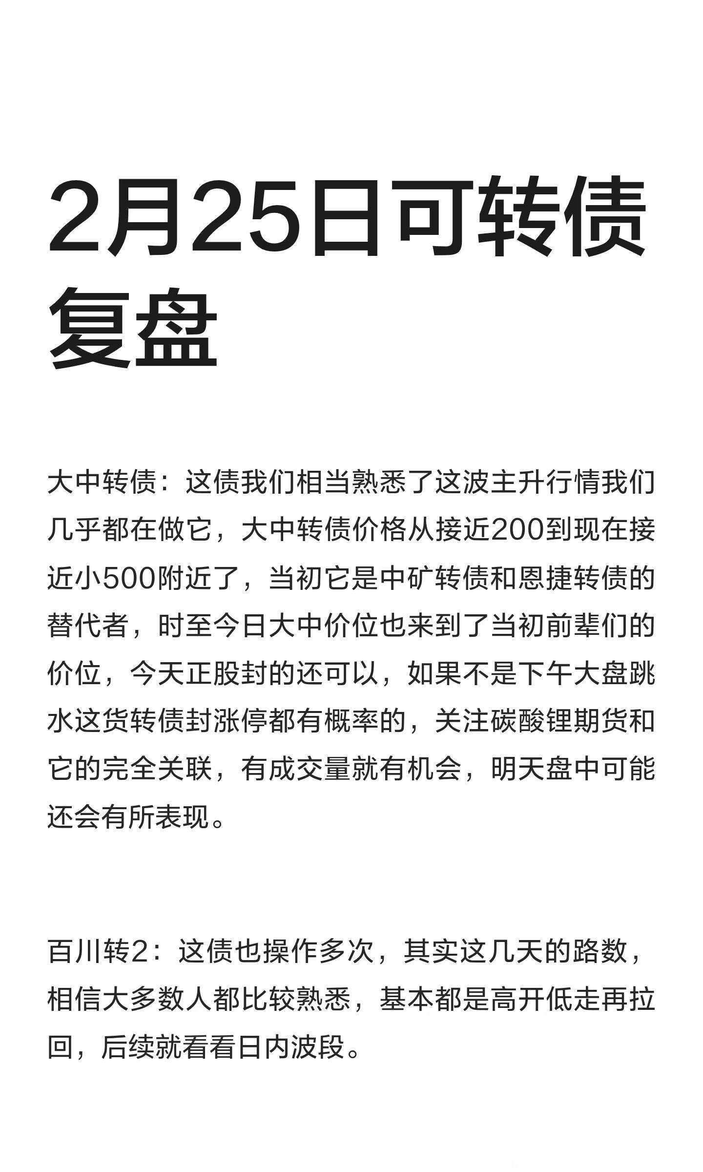 大中转债:这债我们相当熟悉了这波主升行情我们几乎都在做它,大中转债价格从接近200到现在接近小500附近了,当初它是中矿转债和恩捷转债的替代者,时至今日大中价位也来到了当初前辈们的价位,今天正股封的还可以,如果不是下午大盘跳水这货转债封涨停都有概率的,关注碳酸锂期货和它的完全关联,有成交量就有机会,明天盘中可能还会有所表现。百川转2:这债也操作多次,其实这几天的路数,相信大多数人都比较熟悉,基本都是高开低走再拉回,后续就看看日内波段。广联转债:商业航天板块沉迷了很多天后,航天发展今天又让其他航天人眼前一亮,不过今天日内看到后排表现一般,我们还是老生常谈,商业航天转债目前就看广联风向就差不多了。财经a股