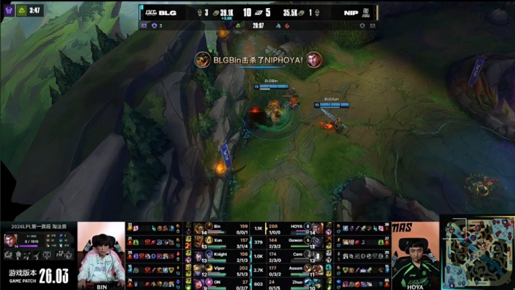 [10:15]下路2v2,ON妮蔻闪现大招控住NIP两人,NIP双人组闪现都没交出就被Viper伊泽瑞尔双杀,BLG打出0换2。
