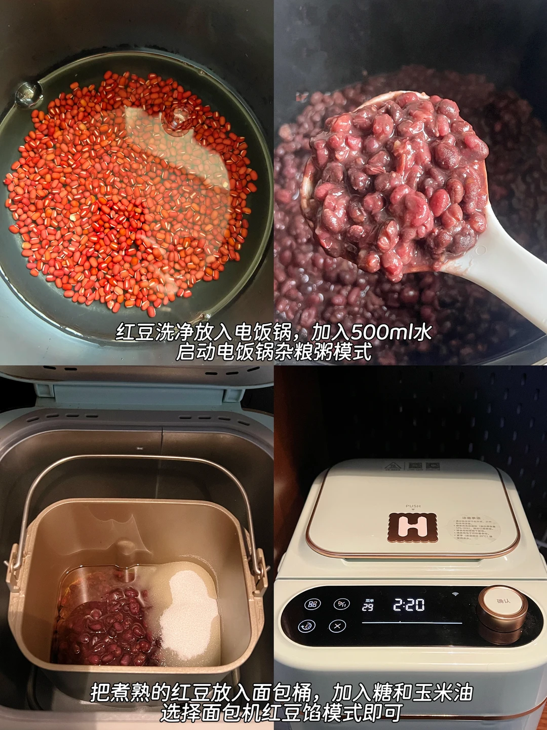 2️⃣第二天,把煮熟的红豆🫘沥干水分倒入面包桶,加入玉米油和白砂糖,选择面包机菜单红豆馅即可