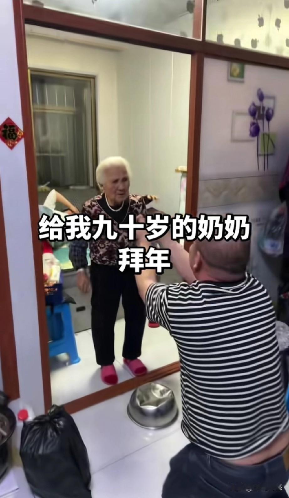给老人拜年磕头,这是过去的一个优良传统,现在磕头的越来越少了,画面中的这个男子,在给老人拜年时,手里拿着一个金属盆子,见到老人,不由分说,跪在地上就往盆子上磕头,90岁的老奶奶不掏钱他就不起来,头磕的咣咣响,眼瞅着盆子底就塌下去了,最后没办法,老奶奶给他300元压岁钱!