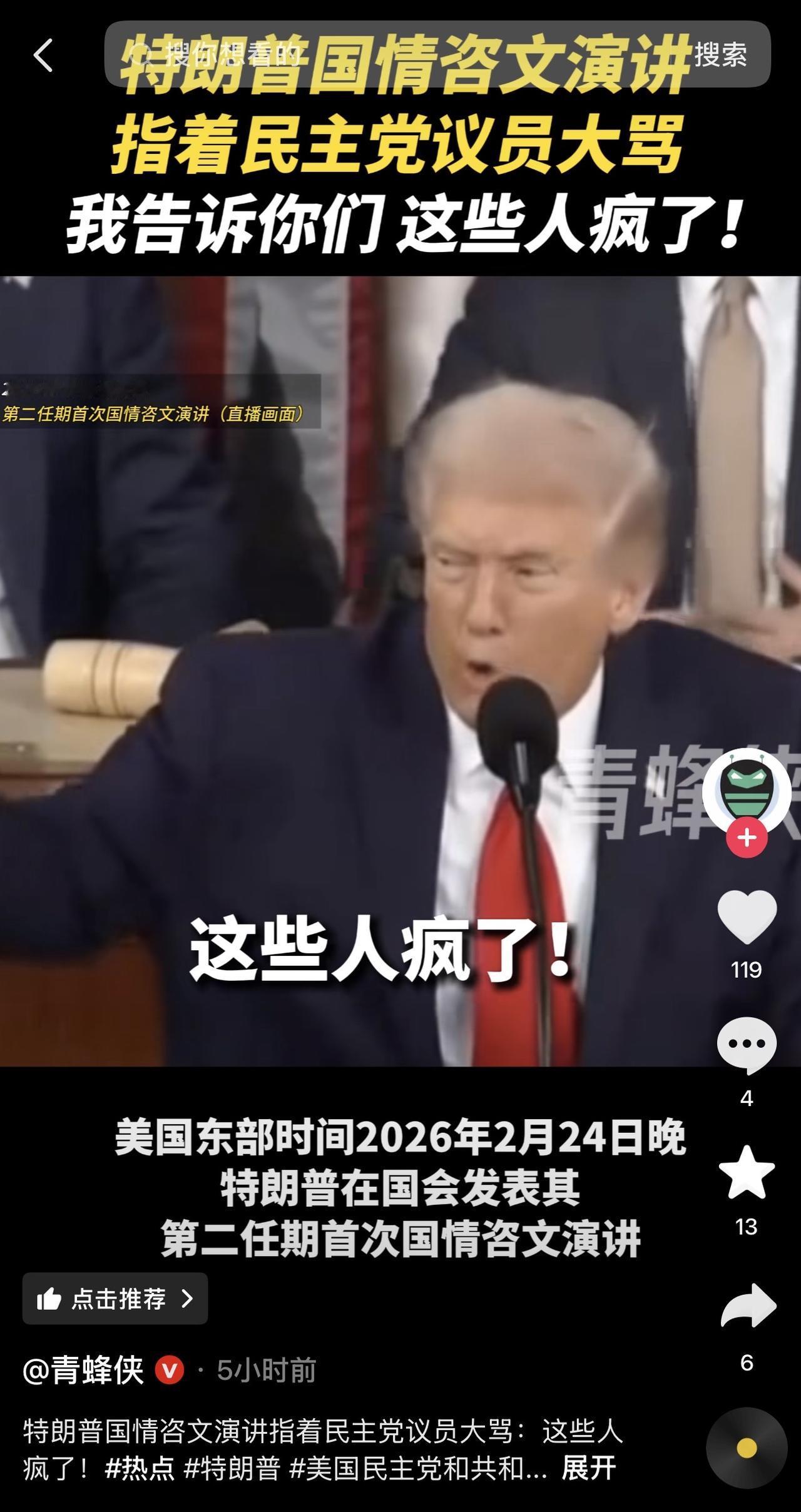 哈哈哈哈哈哈哈,我要笑喷了!特朗普发表国情咨文,一顿狂吹自己,说因为他的存在美国赢麻了!他在任期间阻止了八场战争,老厉害了,现场立刻有笑声,嘲笑他,估计是憋不住了,他立刻回怼! 并且大骂民主党是疯子,还跟民主党女议员现场直接对骂!像菜市场泼妇骂街一样!老招笑了!当然还有民主党议员举横幅,然后被请出去了……场面那叫一个混乱啊!堪比印度火车站! 发现没有,最近美国逐渐印度化了,最先进的航母都载入“屎厕”了,还到处宣讲自己赢麻了!你确实赢了!简直“屎无前例”的赢! 特朗普这精神状态太无敌了!这世界少了他得少多少乐趣啊!!![捂脸][捂脸][捂脸]