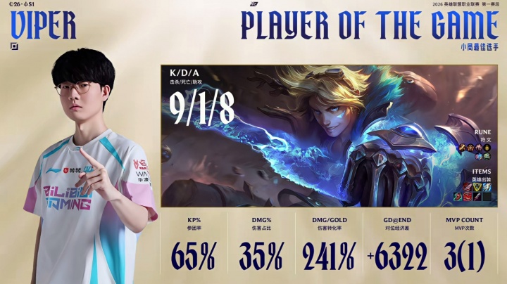 直播吧2月25日讯LPL第一赛段季后赛BLG击败NIP拿下赛点,ViperEZ完美表现打出9-1-8的华丽战绩斩获本局MVP。