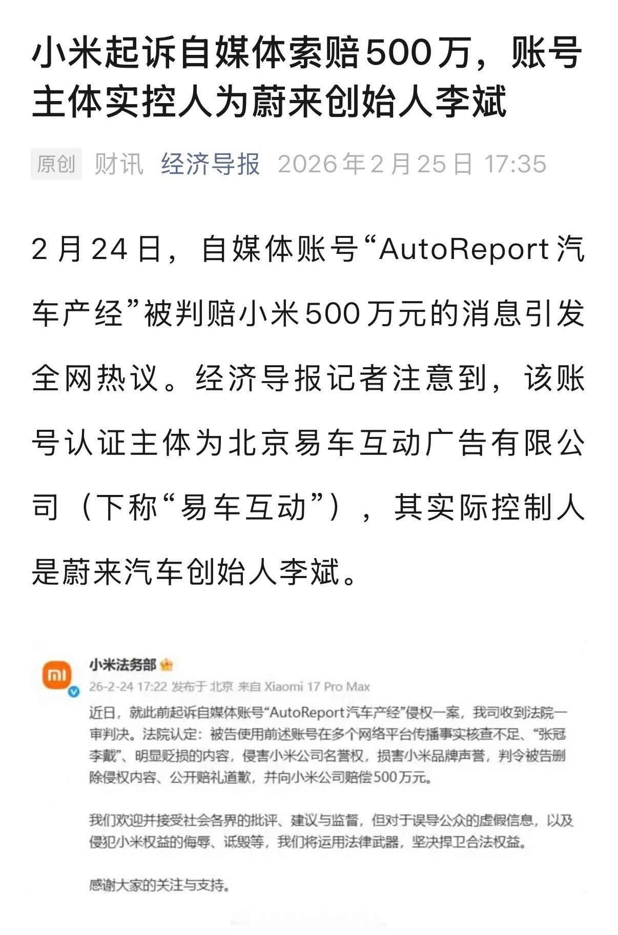 小米起诉的“汽车产经”应该不算“自媒体”,它们是易车旗下的网站;起诉赔500万,