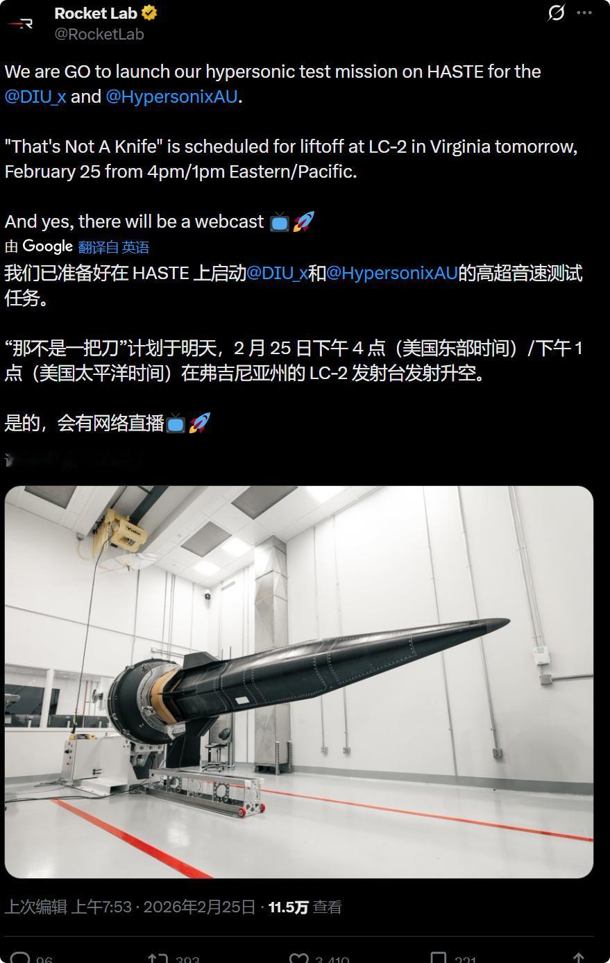 美澳联盟将在今晚进行高超音速导弹测试! 火箭实验室宣布,代号“这不是一把刀”高超音速测试任务将于明天(2月25日)从弗吉尼亚州的LC-2发射台发射升空,并将进行网络直播。他们的HASTE火箭(由电子号火箭改进而来)将搭载澳大利亚Hypersonix公司的DART AE:这是一款3.5米长的超燃冲压发动机驱动飞行器,目标是达到7马赫的速度,并配备可重启的氢发动机。 还说要在真实条件下测试尖端吸气式高超音速技术,获取推进、材料和控制数据,这是六个月内的第四次此类测试,同时也将加强美澳技术联盟。 消息来源于:美国火箭实验室官方X帐号