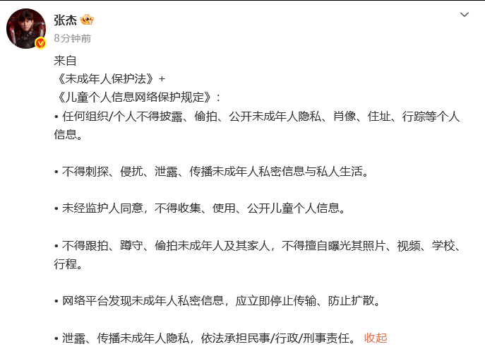 张杰支持谢娜张杰发未成年人保护法内容 继谢娜恳请不要将镜头对准孩子后,发《未成年