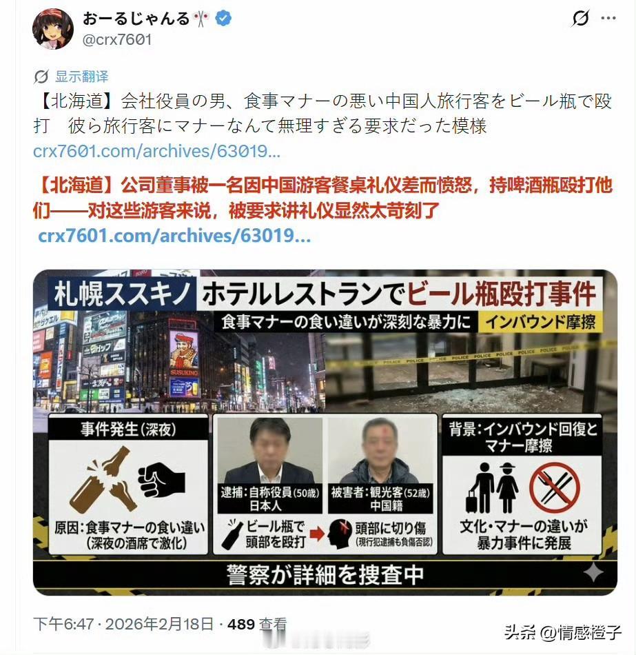 一些香港同胞咋就不听劝呢[叹气]? 刷到一个视频,讲的是今年的2月18号,在日本北海道的凌晨。 一位52岁中国香港籍游客,在当地一家饭馆吃饭。突然跑来一个老八嘎,抡起酒瓶就给他开了瓢[震惊]。 驻日大使馆多次提醒,中国游客近期避免去日本旅游[灵光一闪]。我还查了资料,从26年1月起。 大陆游客赴日游玩数量,和去年比的话,人数总量已跌到六成。那剩下的四成,估计有香港地区的游客吧[机智]? 打人的老八嘎,当场就被抓了。咱们驻日大使馆,已向当地警方交涉,等待后续处理。你对这件事咋看?评论区说下你的看法吧[灵光一闪]。香港游客日本被打 你会因为日本首相的涉台言论改变赴日计划吗 日本 社会