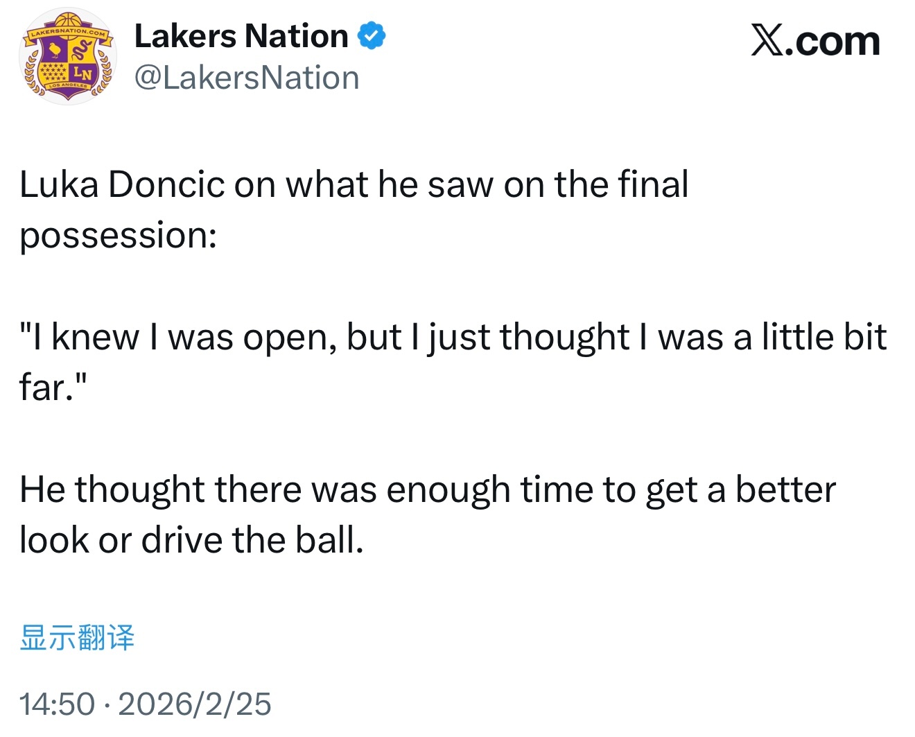 东契奇谈到最后一攻时的想法:“我知道自己处于空位,但我觉得距离篮筐还是稍微有点远