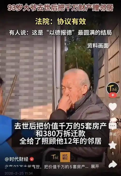 十二年温情守护,善意终得法律回响 一位孤寡老人,无亲无故、晚景孤单;一位普通邻居,不计回报、倾心相伴。十二载寒来暑往,邻居刘某用日常照料与耐心陪伴,为老人撑起安稳晚年,从饮食起居到病中守护,始终不离不弃。 老人感念这份超越血缘的温情,立下遗赠扶养协议,将千万遗产交由刘某继承。老人离世后,虽有亲属提出异议,但法律以事实为依据,认可了十二年的真心付出。 法院最终判决遗产归刘某所有,这不仅是对老人意愿的尊重,更是对人间善意的郑重肯定。善行不被辜负,真心自有回响,平凡善举照亮世道人心,也让法治温度温暖人心。