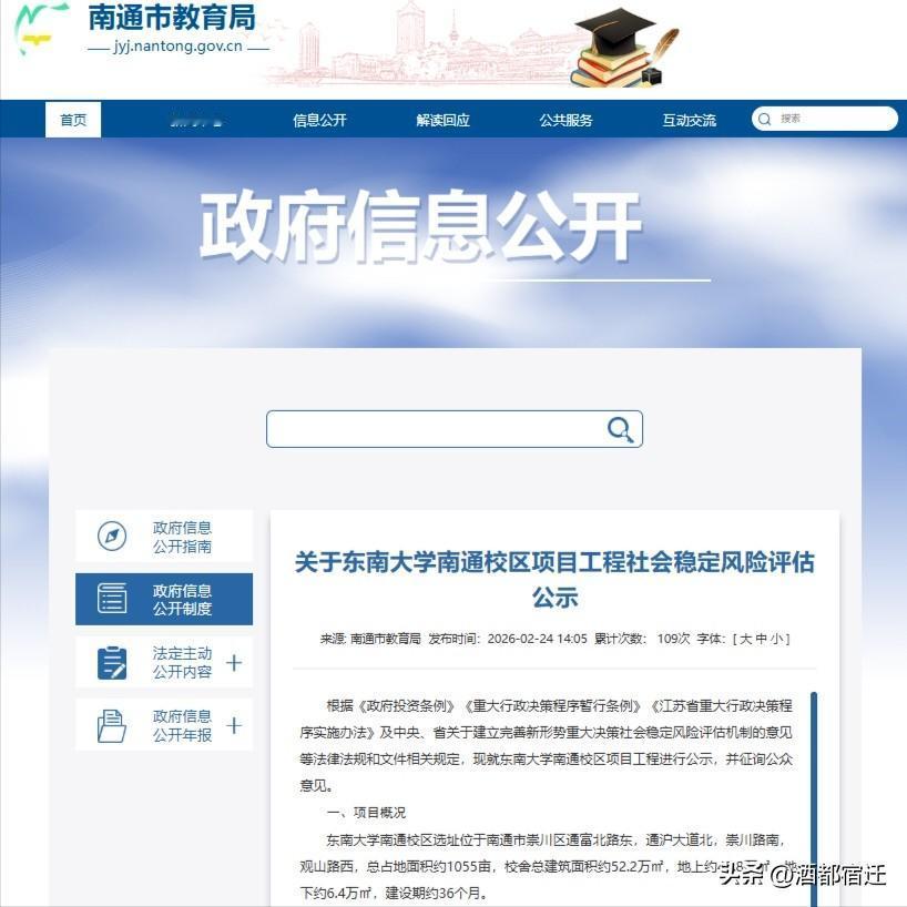好消息!GDP突破1.28万亿元的万亿之城江苏南通,即将迎来一个历史性时刻——东南大学南通校区正式迈入实质推进阶段。这座江海门户即将补齐顶尖高等教育的短板,迎来第一所“985”“双一流”高校。 2026年2月24日,南通市教育局发布了东南大学南通校区社会稳定风险评估公示,标志着项目落地驶入快车道。校区选址于崇川区创新区,占地约1055亩,总建筑面积约52.2万平方米,建设期约36个月。一座高标准、现代化的大学校园即将崭露头角。 东南大学作为教育部直属的国内顶尖985高校,在工科、建筑、医学等领域实力强劲。此次落户南通,不仅填补了当地没有顶尖高校的空白,更将为城市带来优质的科研资源、高端人才和创新动力,深度赋能船舶海工、先进制造等优势产业。 从经济强市迈向科教新城,南通正以名校落地为契机,打通产业、人才、创新的闭环。不久之后,江海之滨将回荡起顶尖学府的朗朗书声,万亿南通的发展蓝图,因这所985大学而更具想象空间。