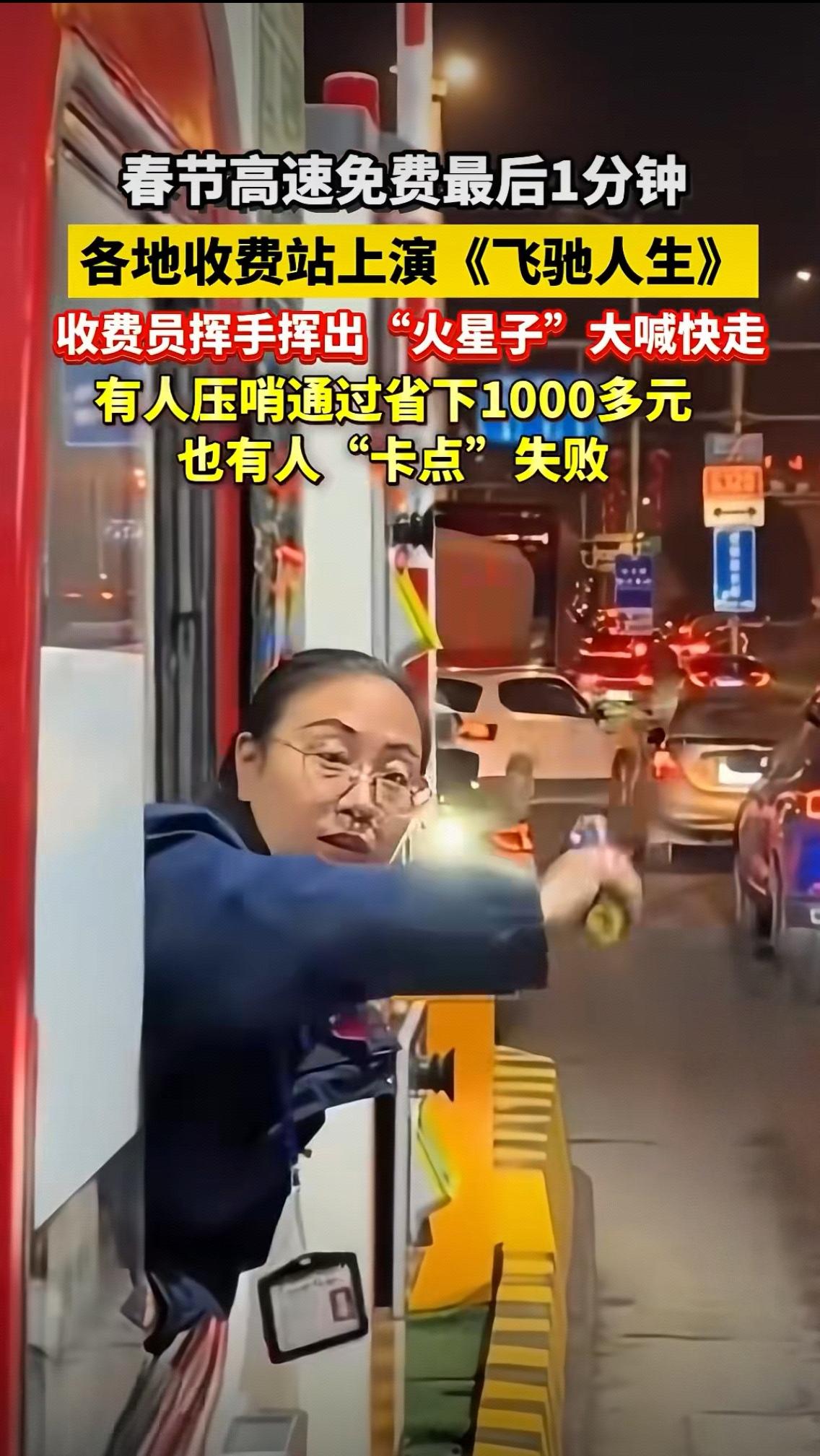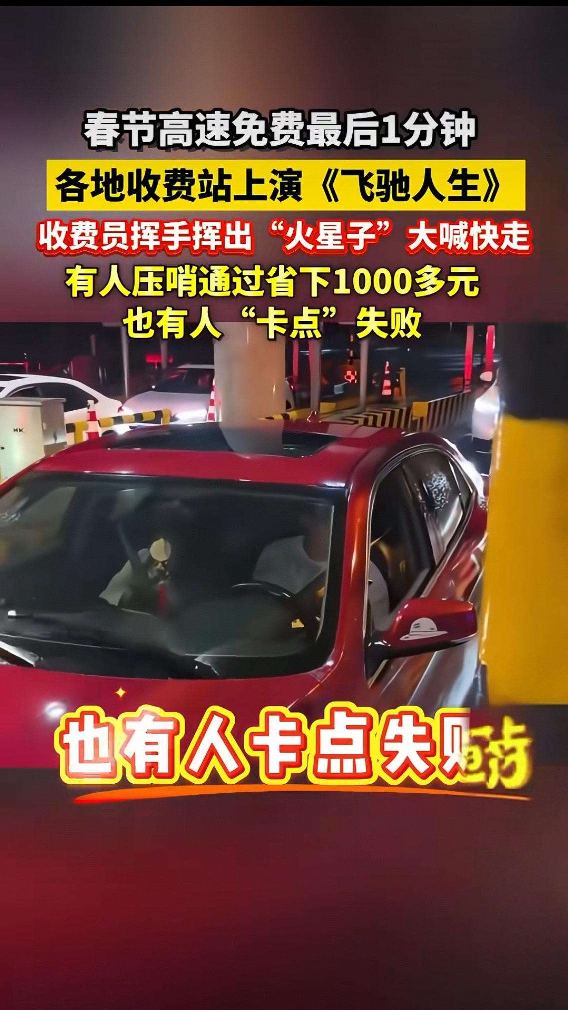 春节高速最后1分钟:有人省千元,有人差12秒买单,最暖的是那双手 2月23日23点59分,全国高速收费站的空气仿佛都在燃烧。收费员半个身子探出窗口,手臂挥得带出残影,嘶吼着“快走!最后一分钟!”,这场现实版《飞驰人生》,比电影更戳人心。 武汉龚家岭收费站,蒙A牌照车主王先生一脚油门,在倒计时中冲过闸口,和朋友两台车直接省下1000多元,隔着车窗都能感受到那份雀跃 。江苏苏州的李先生更精准,23点59分52秒通过,380公里的通行费415元,分文未花。 有人欢喜,就有人遗憾。广州的王女士晚了12秒,系统无情跳出428元全程费用,她坐在车里,满脸无奈。黄梅的柳先生只因在服务区多歇半小时,80多元路费打了水漂 。这短短几十秒,像一面镜子,照出了人们对生活的精打细算。 最动人的,是那些拼命挥手的收费员。他们不是在完成工作,而是在为陌生人的生活助力。要知道,高速免费判定只看驶离时间,精确到秒,没有任何弹性。他们的嘶吼,是最朴素的善意。 其实,比起这几百上千元,平安才是最大的财富。每年此刻,都有车主为抢秒加塞、超速,最终剐蹭事故,得不偿失。 这场“秒针大战”落幕了,你有没有过卡点的经历?是幸运省了钱,还是遗憾买单?评论区聊聊你的故事,咱们一起为平安出行点个赞!春节高速收费 春节高速收费站