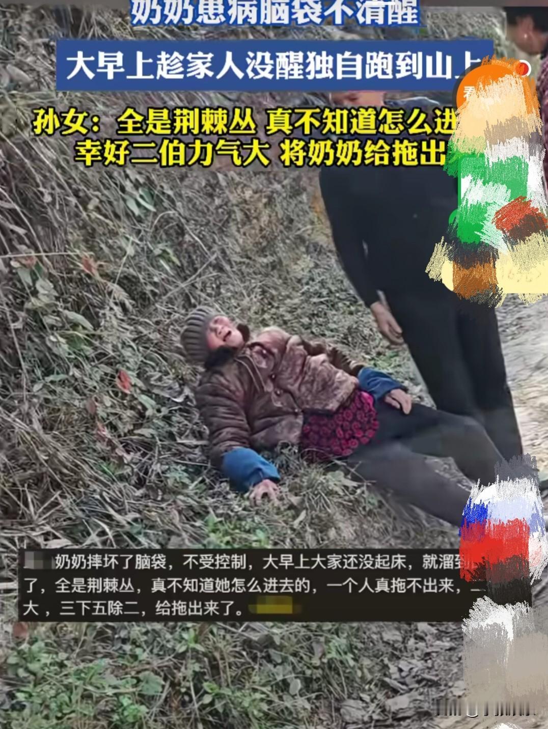“太心酸了” 天刚蒙蒙亮,村庄还笼罩在薄雾里,一阵急促的呼喊声打破了宁静。 患病的奶奶又不见了。 她去年摔伤头部后,认知就变得模糊,常常不受控制地独自外出。这一次,她趁着家人熟睡,悄悄摸出钥匙,溜进了屋后那片人迹罕至的深山。 当家人发现院门虚掩、床铺空荡时,所有人的心都揪了起来。他们立刻抄起手电筒和柴刀,疯了似的冲进山里。这片山林布满了一人多高的荆棘丛,带刺的藤蔓像网一样交织,碎石和烂泥让每一步都走得艰难。 “奶——”孙女的声音带着哭腔,在空旷的山谷里回荡,却只换来风吹过树叶的沙沙声。二伯走在最前面,他身材魁梧,手里的柴刀上下挥舞,硬生生在荆棘丛中劈出一条路。他的手臂被划出道道血痕,衣服也被勾破了好几处,却丝毫没有放慢脚步。 不知过了多久,二伯的脚步突然顿住。在荆棘丛最深处,他看到了那个蜷缩的身影。奶奶被困在藤蔓和乱草之间,棉袄被撕得破烂,脸上、手上布满了血道子,嘴唇冻得发紫,嘴里含糊地念叨着,裤脚被死死缠住,根本无法动弹。 “别慌,我来!”二伯蹲下身,用柴刀一点点割断缠在奶奶身上的藤蔓。每割一下,奶奶都会疼得轻哼,他的动作便立刻放轻。 等所有束缚都被解开,他深吸一口气,将奶奶背了起来。 荆棘勾住他的后背,他咬着牙硬生生扯断;脚下的泥地湿滑,他就把脚扎得更深,每一步都走得沉稳而坚定。 当他们终于走出荆棘丛,来到开阔的山路上时,二伯的后背已经被血浸透,奶奶虚弱地靠在他的肩头,眼神却渐渐有了焦距。 家人围了上来,有人递上热水,有人检查伤口,孙女看着奶奶身上的伤痕,眼泪止不住地往下掉。 后来大家才知道,奶奶那天凌晨醒来,恍惚中以为孙女还在村口等她,便想出门去找,却迷了路,一头扎进了深山。 这场惊魂的救援过后,家人给奶奶的衣服缝上了定位器,院门也换成了更安全的锁具。 每当有人提起那天的经历,二伯总是摆摆手说“没事”,但孙女永远记得,那个清晨,是二伯用有力的臂膀,从危险的边缘把奶奶拉回了家。 真实事件 家人平安 亲情守护 生活纪实 人间温暖