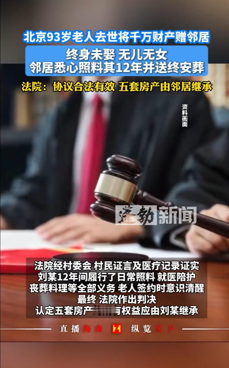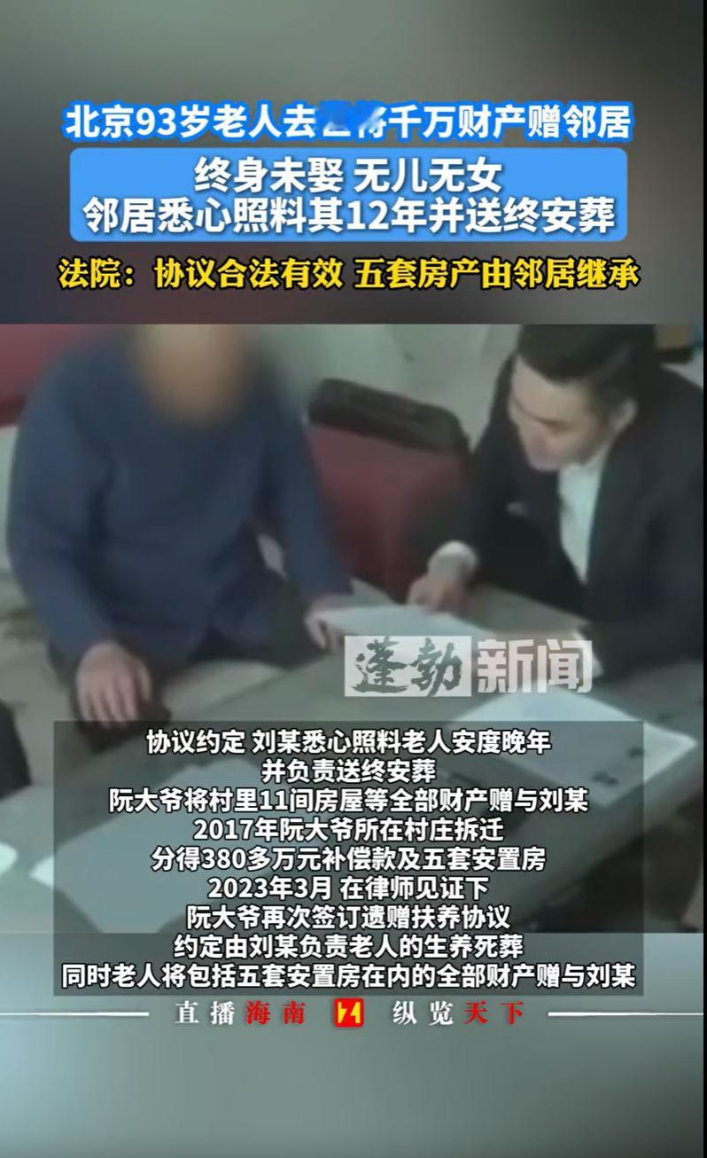 北京,一位93岁的大爷,终身未娶,无儿无女,虽有兄弟姐妹却来往不多。村里人一男子看大爷孤苦,便签下一份协议,承诺负责大爷的生养死葬,大爷则将名下财产留给他。这一照顾,就是整整12年,比亲儿子还亲。后来赶上拆迁,当初那几间老屋竟换来了五套安置房和380多万补偿款,总价值上千万。大爷一走,平时不见影的亲戚们全冒了出来,说这财产不能便宜了外人。最后闹到法院。法院这样判决。 据悉,2011年的时候,阮大爷已经是位81岁高龄的老人了。 他这一辈子,可以说是孤孤单单一个人,终身未娶,膝下无儿无女。 说起来,他上头有四个哥哥和一个妹妹,按理说亲人不少,可实际上,大家平日里走动得不多,关系也就那样,谈不上多亲近。 那时候,阮大爷身体还行,但脑子清楚得很,他琢磨着,自己百年之后,这身后事谁来操办?这几间老屋留给谁? 与其到时候让亲戚们闹纠纷,不如趁自己明白,提前做个了断。 巧的是,村里有个叫刘某的村民,是个实在人,平时跟阮大爷也处得来。 村委的人看在眼里,就动了个心思,想着能不能撮合一下,让刘某照顾阮大爷的晚年,老人这房子也算是有了个归宿。 刘某也是个爽快人,一想阮大爷孤苦无依,自己家也多双筷子的事,就答应了。 于是,在2011年,在村委会的见证下,阮大爷和刘某郑重其事地签了第一份遗赠扶养协议。 协议写得明明白白:刘某得负责阮大爷的吃喝拉撒、头疼脑热,把老人伺候好,最后还得披麻戴孝,办好后事;相应的,阮大爷百年之后,他在村里的那11间老房子,就全归刘某所有。 签了协议之后,刘某说到做到,这一照顾就是十几年。 平日里,刘某就像对待自己亲爹一样,嘘寒问暖,送饭送菜,生病了跑前跑后,住院了端屎端尿。 阮大爷那颗孤寂了大半辈子的心,总算是有了着落,逢人便夸刘某比亲儿子还亲。 日子就这么一天天安稳地过着。 2017年,村里传来拆迁消息,阮大爷那11间老屋一拆,竟然换来380多万的拆迁补偿款,外加五套崭新的安置房! 这下,情况变得复杂了。 当初签协议时,那11间破瓦房值不了几个钱,刘某图的真就是个情分和心安。 可如今,这11间房摇身一变,成了价值千万的资产。 阮大爷虽然年事已高,但心里跟明镜似的,他看得很透,自己这把老骨头,要不是刘某这六七年来的悉心照料,能不能活到拆迁都难说。 这福气,是刘某带来的。 阮大爷的几个侄子侄女、外甥外甥女,也就是他那些哥哥妹妹的孩子们,这时候心思也开始活泛了。 虽说平时来往不多,但这毕竟是自家亲大爷的财产,这么大一笔,怎么能便宜了一个外人? 阮大爷察觉到了亲戚们的动静,心里门儿清,他担心自己百年之后,刘某会因为这份财产被亲戚们纠缠,也担心那份老协议会因为财产性质的改变而产生争议。 为了让刘某安心,也为了确保自己的心愿能达成,2023年3月,身体已经不太好的阮大爷做了一个决定,在律师的见证下,重新签订一份遗赠扶养协议。 这一次,协议写得更加严谨,条款更加清晰。 2023年9月,93岁的阮大爷安详地闭上了眼睛。 刘某悲痛万分,但他没有忘记自己的承诺,风风光光、体体面面地为老人操办了后事,让老人入土为安。 丧事办完,正如阮大爷生前所料,那些平日里难得露面的亲戚们出现了,他们认为自己是阮大爷的法定继承人,质疑刘某手里协议的效力,不承认这份协议。 面对这种情况,刘某没有选择私下争吵或妥协,一纸诉状递到法院,请求法院确认这两份遗赠扶养协议的法律效力,让他能够名正言顺地继承这笔遗产。 有人说,那些亲戚十几年不见人影,老人活着的时候不来伺候,离世了倒跑来抢房子,天底下哪有这么便宜的事? 也有人说,老人糊涂啊,毕竟是自己的亲侄子亲外甥,身上流着一样的血。就算平时走动少,那也是亲戚。把上千万财产全给外人,自家晚辈心里能好受吗?面子上也挂不住。 法院会如何判决呢? 《民法典》第一千一百二十三条规定,继承开始后,……有遗赠扶养协议的,按照协议办理。 第一千一百五十八条规定,自然人可以与继承人以外的组织或者个人签订遗赠扶养协议。按照协议,该组织或者个人承担该自然人生养死葬的义务,享有受遗赠的权利。 法院指出,2011年的首份协议有村委会见证,2023年的补充协议有律师见证,两份均系阮大爷在神志清醒时的真实意思表示。 而刘某更是实打实地履行了12年的扶养义务,邻居和村委会都能作证,他让老人安享了晚年,并完成了送终安葬。 法院认为,刘某完全履行了生养死葬的义务,协议真实有效。 此外,阮大爷那些亲戚虽是法定继承人,但在合法有效的协议面前,法定继承权就得往后站。 刘某用12年的真心照料换来了这份遗产,法律得认这笔账。 最终,法院判决五套房产归刘某。 对此,您怎么看?