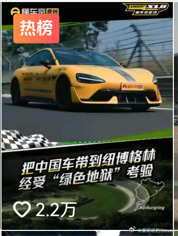 纽博格林(纽北)开通了短视频官方账号,目前的置顶视频,懂车帝制作的纽北系列其中小米Su7ultru直线单杀了保时捷911gt3RS。中国车加油吧。