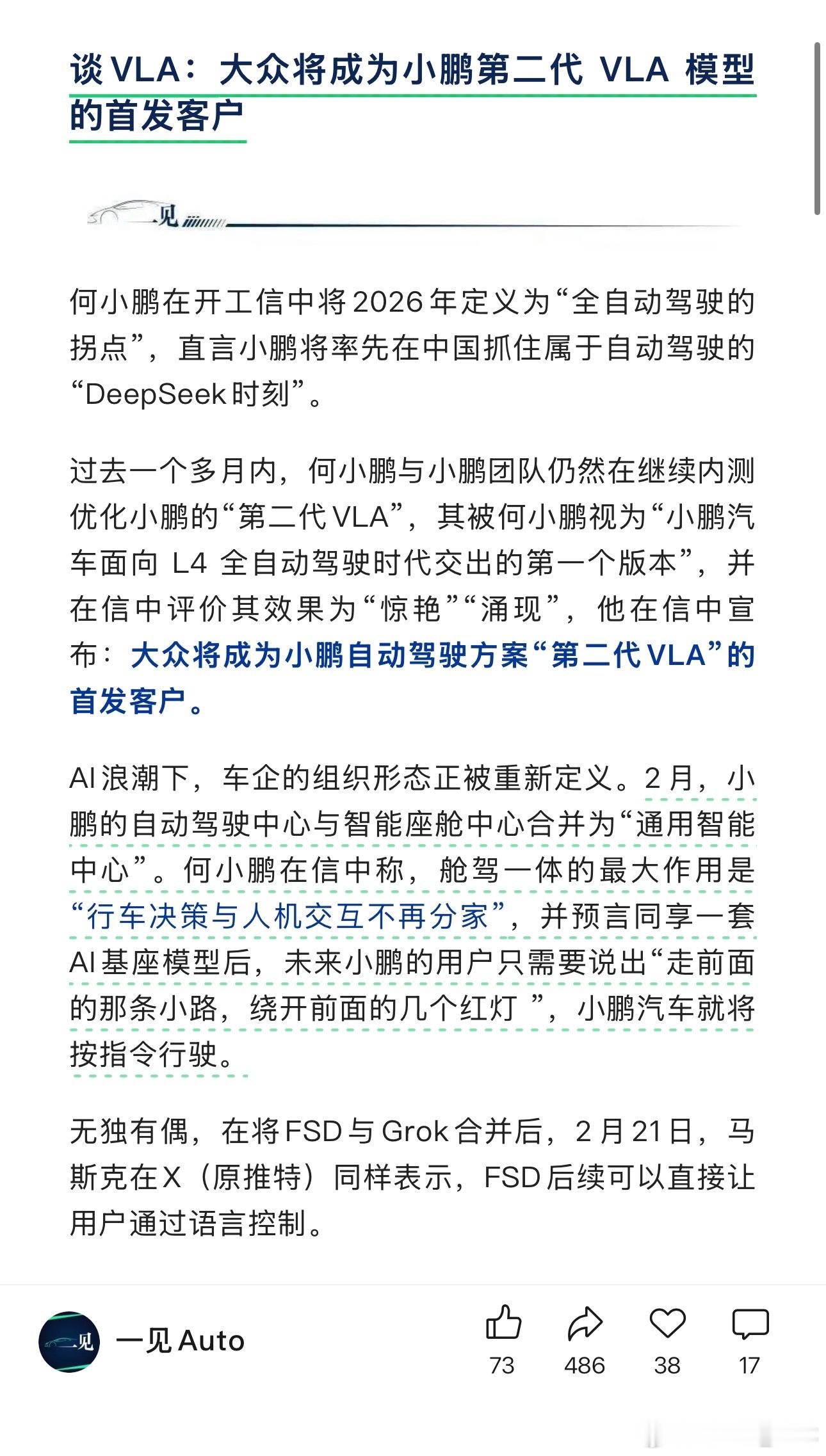 大众将成为小鹏 VLA 2.0 智驾方案的首个商业客户,互利共赢。这也意味着,小