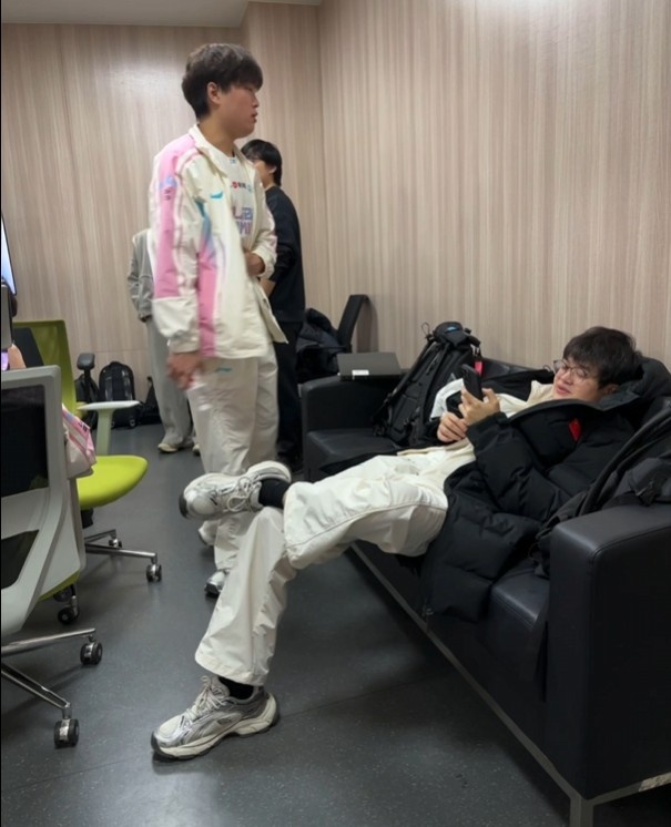 休息室里,Bin一开始坐在沙发上,站起来后Xun坐了过来,Bin哥:你把我位置抢了呀!